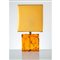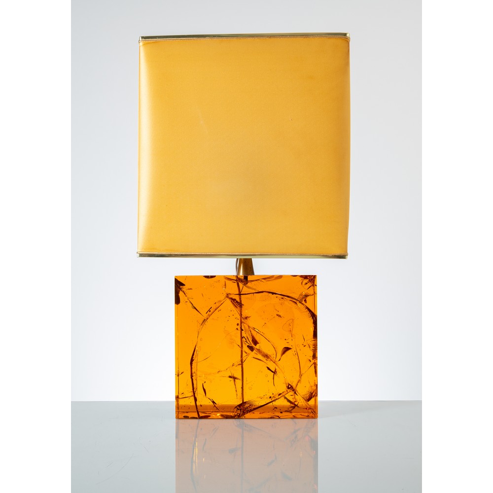 Lampada da tavolo ad una luce, struttura in resina color ambra, corpo quadrato, diffusore color avorio bordato in oro. Lievi graffi.