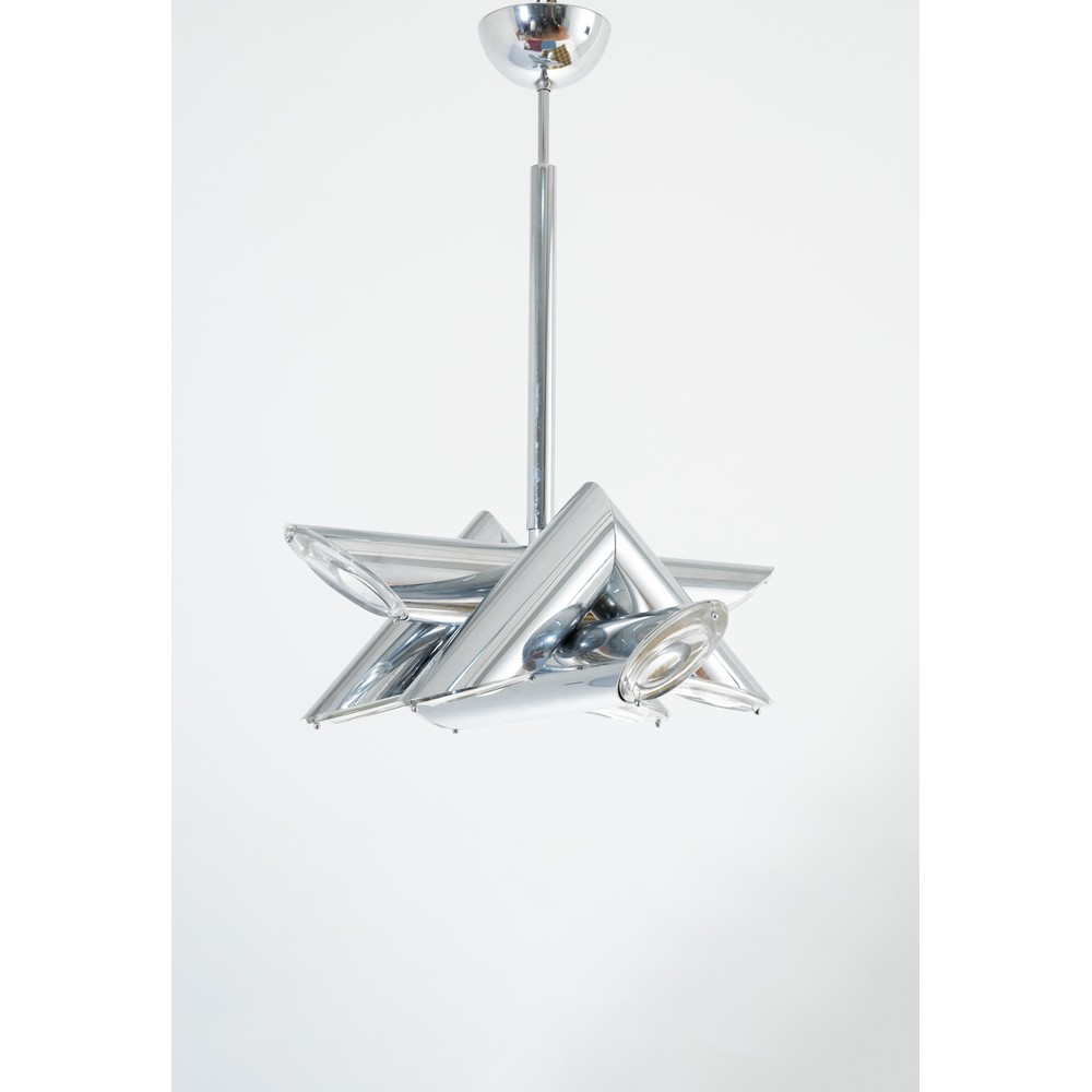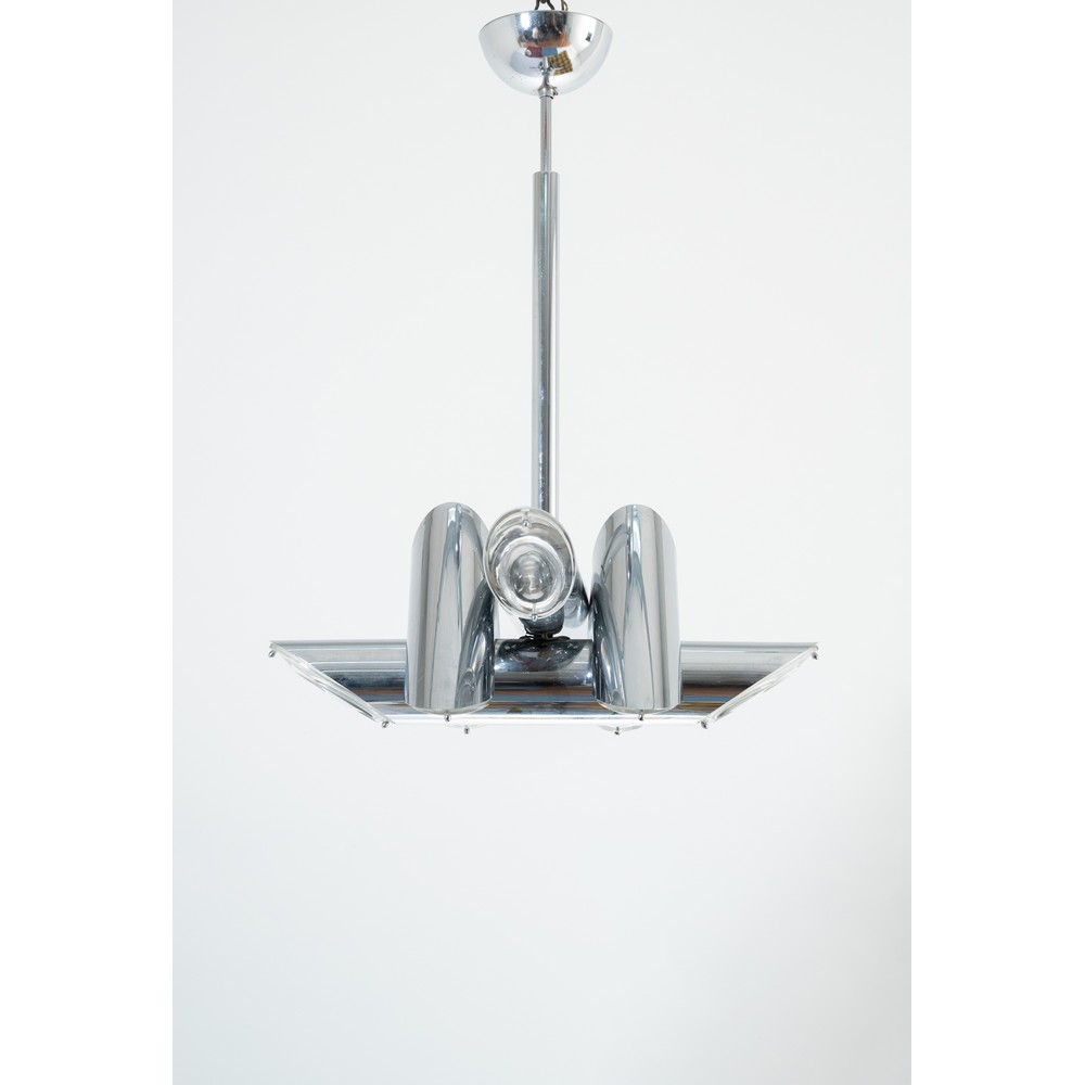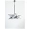 Lampada a sospensione ad otto luci, struttura composta da otto cilindri in acciaio cromato, diffusore a lente in vetro di grosso spessore trasparente.