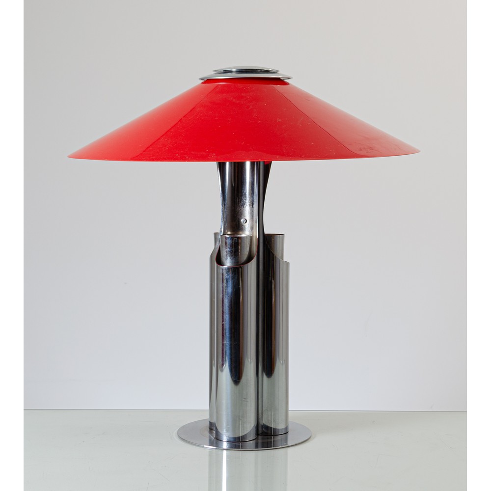 Lampada da tavolo a tre luci, struttura in tubolare di acciaio cromato, diffusore conico in metacrilato rosso, base circolare.
