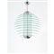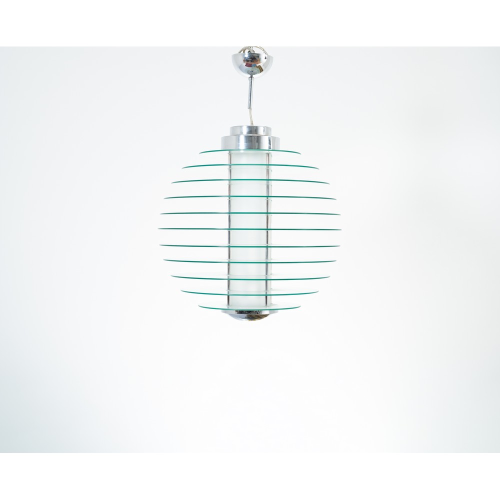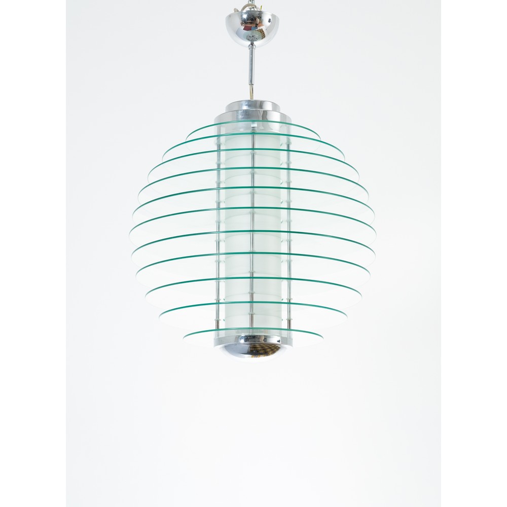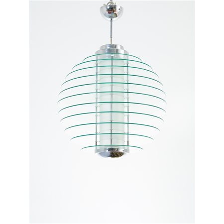 Lampada a sospensione a due luci, riedizione del modello “0024” del 1933, struttura in ottone cromato, diffusore sferico composto da dischi orizzontali in vetro trasparente con al vetro un cilindro in vetro opalino satinato.