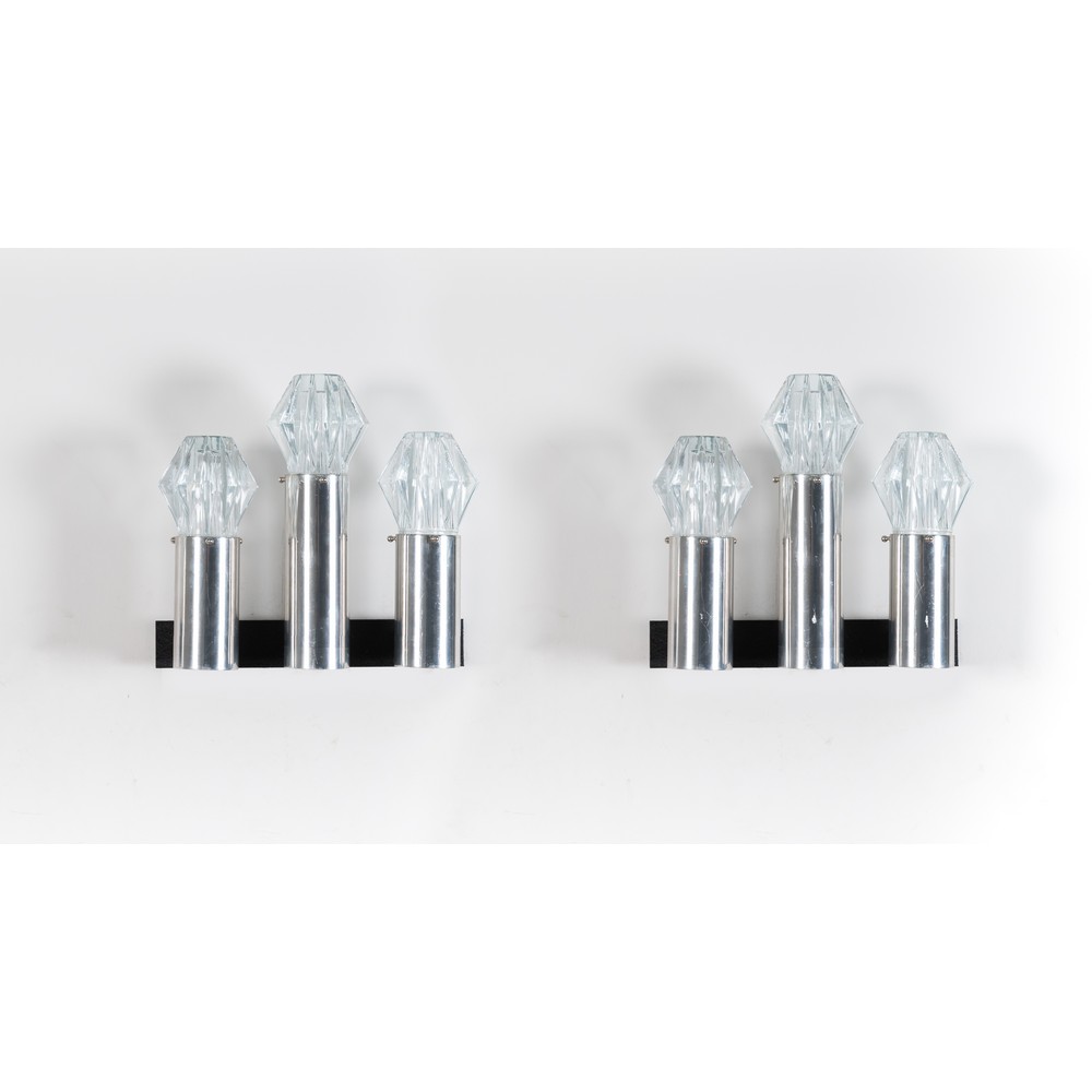 Coppia di lampade da parete ad una luce con struttura conica in acciaio cromato, diffusore in vetro sfaccettato trasparente. Etichetta di produzione. Lieve sbeccatura ad un diffusore nella parte ad incastro.