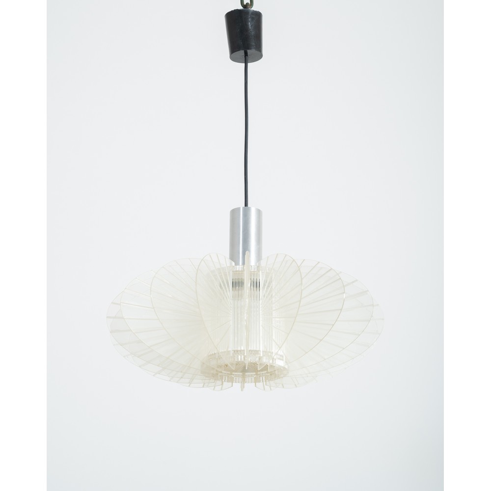 Lampada a sospensione ad una luce, struttura in metallo cromato e verniciato nero, diffusore circolare in plexiglass composto da elementi semiellittici decorati con rigature e incastrati al cilindro centrale.