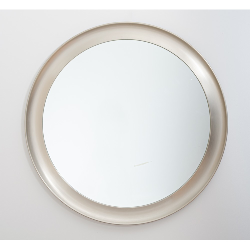 Grande specchio da parete modello “Narciso” corpo circolare con cornice in metallo spazzolato e cristallo specchiato.
