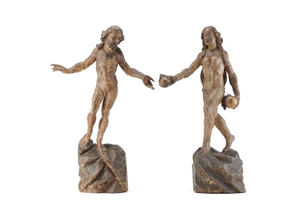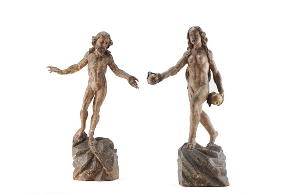 Sculptor of Alto-Veneto, 17th century. "Original Sin" two carved wooden figures with traces of polychrome depicting Adam with open arms and Eve holding with his right hand the apple of sin, on rocks (h. cm 65) (defects and restorations)