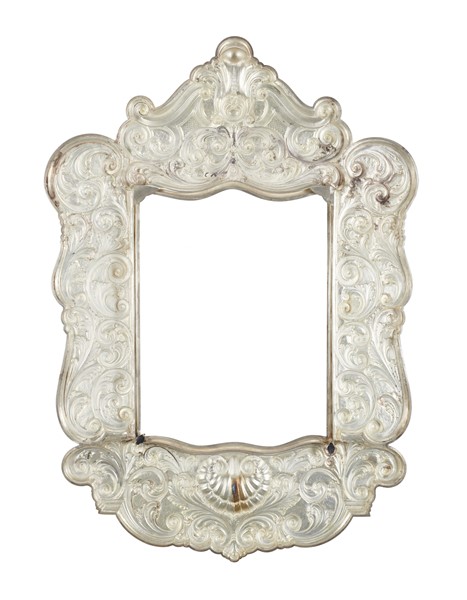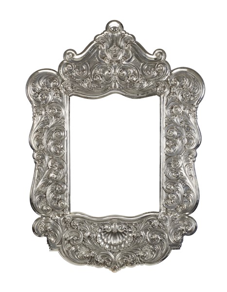 Grande cornice di forma sagomata in argento sbalzato e inciso con decoro a volu