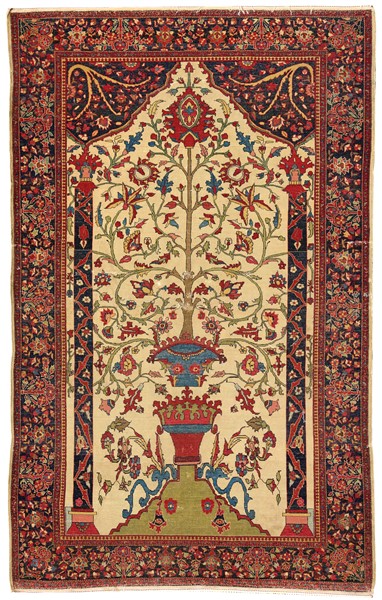 Tappeto preghiera Ferahkan, Persia, inizio secolo XX. Mirab a fondo bianco decorato da un vaso con albero della Vita, due colonne di Persepoli a fondo blu notte con decoro a meandro, bordura Herati policroma su fondo blu notte (cm 206x132) (difetti e vecchi restauri)