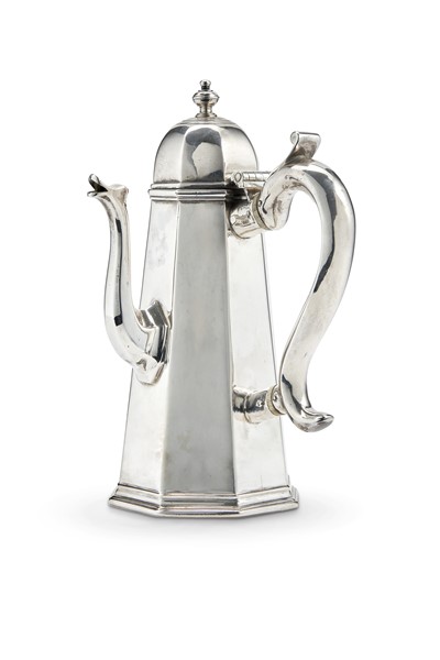 Cioccolatiera in argento a corpo sfaccettato ottagonale con cresta incisa, ansa a voluta con ghiere in osso, versatoio zoomorfo, presa a trottola. Reca nel fondo punzoni dell'argentiere Thomas Parr. Londra, 1697 (g lordi 580) (h. cm 21) (lievi difetti)