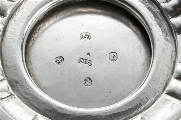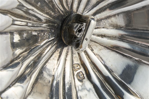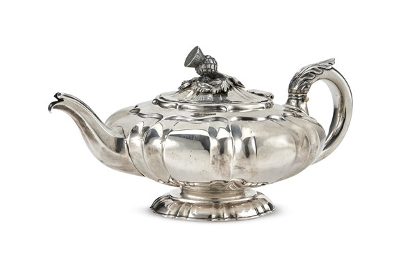 Teiera in argento a corpo costolato, ansa fogliata con ghiere in osso, presa del coperchio a ramo con pigna e fiore. Londra, 1832. Argentiere Michael Starkey (h. cm 11) (g 700) (lievi difetti)