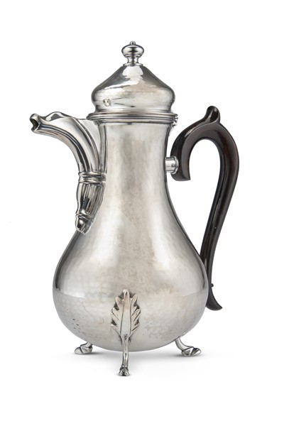 Caffettiera in argento martellato, presa del coperchio a trottola, ansa mossa i