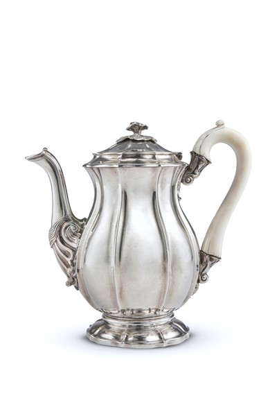 Teiera in argento a corpo costolato, coperchio con presa in forma di rosa a tutto tondo. Ansa in avorio sagomato. Londra, 1804. Argentiere William Eaton (g lordi 900) (h. cm 22) (difetti)
