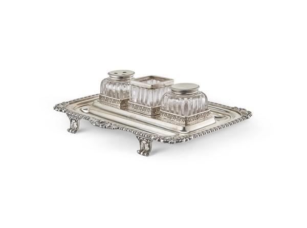 Calamaio in argento con base a bordo decorato a volute fogliate e valve di conchiglia poggiante su quattro piedini a ricciolo, tre boccette in vetro baccellato con coperchi e bordi in argento. Monogramma "AR" inciso. Londra, 1808. Argentiere John Crouch (base: cm 31x25) (g 1250) (difetti)