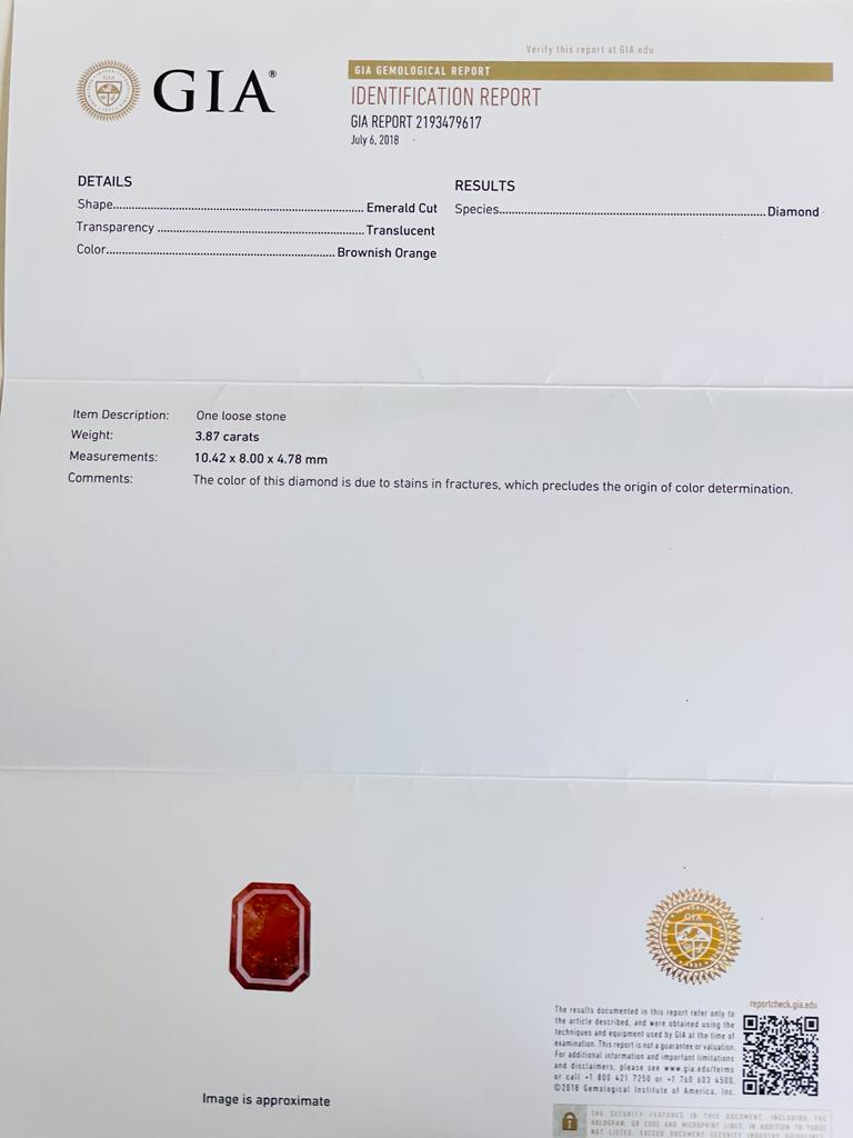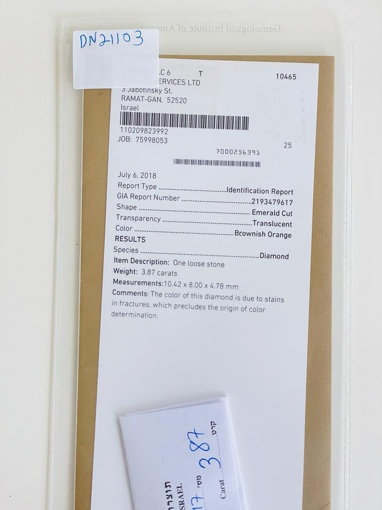 DIAMANTE NATURAL POLISHED 3,87 CARATI COLORE MARRONCINO ARANCIO TAGLIO SMERALDO - CERTIFICATO GIA - DN21103