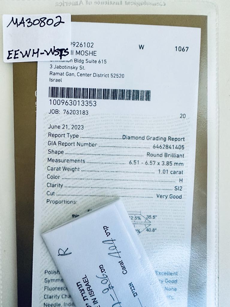 DIAMANTE 1,01 CARATI H - PUREZZA SI2 - TAGLIO BRILLANTE - CERTIFICATO GIA - MA30802