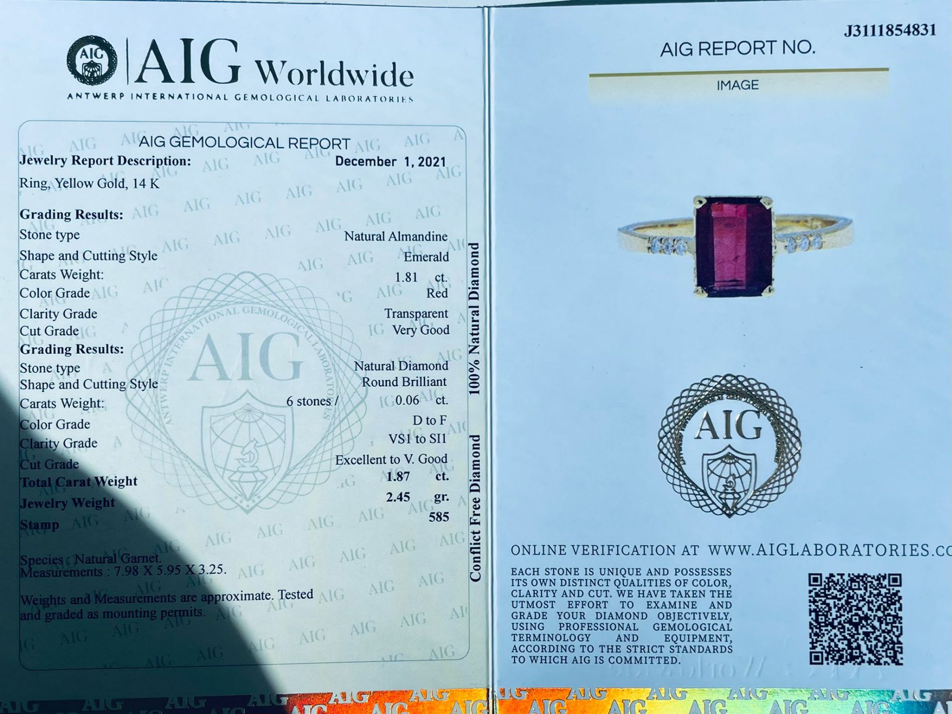 ANELLO IN ORO GIALLO 14K 2.45 GR GRANATO SINTETICO E CON DIAMANTI PER 1.81 + 0.06 CARATI COLORE D-F/ PUREZZA VS1-SI1 TAGLIA:6.5 - CERTIFICATO AIG - RNG11103
