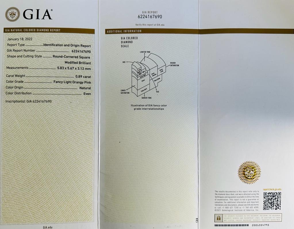 DIAMANTE 0,89 CT NATURAL FANCY CHIARO ORANGY ROSA TAGLIO CUSCINO - CERTIFICATO GIA - F30202