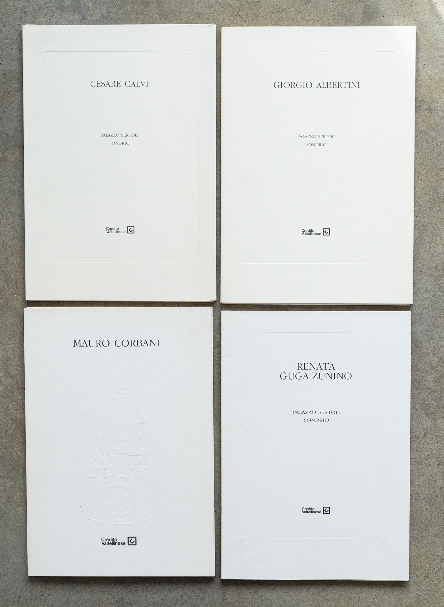 LOTTO MULTIPLOLotto di quattro cataloghiRenata Giga-Zunino - Autoritratto ovvero Hotel Lisbona e dintorni. Opere dal 1991 al 19951995Catalogo monografico illustrato edito in occasione della mostra tenutasi presso Palazzo Sertoli, Sondrio (1995)34 x 23,7 cmEdizione Credito ValtellinesePagine 69Senza difettiMauro Corbani - Il velo lacerato1993Catalogo monografico illustrato edito in occasione della mostra tenutasi presso Palazzo Sertoli, Sondrio (1993)34 x 23,7 cmEdizione Credito ValtellineseSenza numero di pagineDifettiCesare Calvi - Arcaismi1995Catalogo monografico illustrato edito in occasione della mostra tenutasi presso Palazzo Sertoli, Sondrio (1995)34 x 23,7 cmEdizione Credito ValtellineseSenza numero di pagineDifettiGiorgio Albertini - L'arte della finzione. Opere dal 1984 al 19941994Catalogo monografico illustrato edito in occasione della mostra tenutasi presso Palazzo Sertoli, Sondrio (1994)34 x 23,7 cmEdizione Credito ValtellineseSenza numero di pagineDifetti