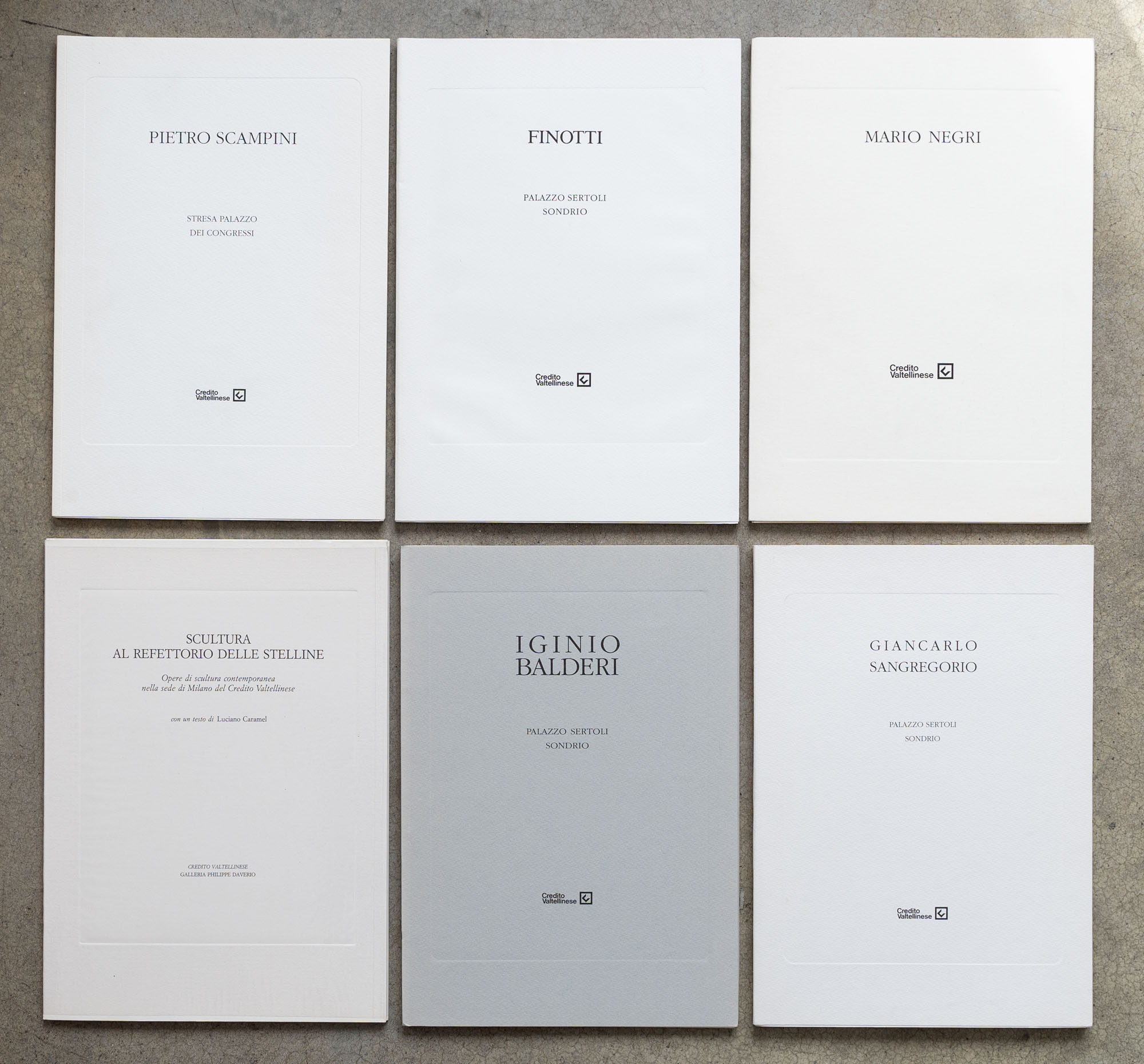LOTTO MULTIPLOLotto di sei cataloghiGiancarlo Sangregorio 1966-19961997Catalogo monografico illustrato edito in occasione della mostra tenutasi presso Palazzo Sertoli, Sondrio (13 maggio - 28 giugno 1997)34 x 23,7 cmEdizione Credito ValtellinesePagine 77DifettiOmaggio a Mario Negri1987Catalogo monografico illustrato edito in occasione della mostra tenutasi presso la Galleria Credito Valtellinese, Sondrio (1987)34 x 23,7 cmEdizione Credito ValtellineseSenza numero di pagineSenza difettiScultura al Refettorio delle Stelline1988Catalogo illustrato edito in occasione della mostra tenutasi presso la Galleria Credito Valtellinese, Sondrio (1988)34 x 24,3 cmEdizione Credito ValtellineseSenza numero di pagineSenza difettiIginio Balderi1992Catalogo monografico illustrato edito in occasione della mostra tenutasi presso Palazzo Sertoli, Sondrio, Sondrio (1992)34 x 23,7 cmEdizione Credito ValtellinesePagine 51Senza difettiFinotti1990Catalogo monografico illustrato edito in occasione della mostra tenutasi presso Palazzo Sertoli, Sondrio, Sondrio (1990)34 x 24,4 cmEdizione Credito ValtellineseSenza numero di pagineSenza difettiPietro Scampini - Sculture Disegni Intrecci1996Catalogo monografico illustrato edito in occasione della mostra tenutasi presso Palazzo dei Congressi, Stresa (1996)34 x 23,5 cmEdizione Credito ValtellinesePagine 49Difetti