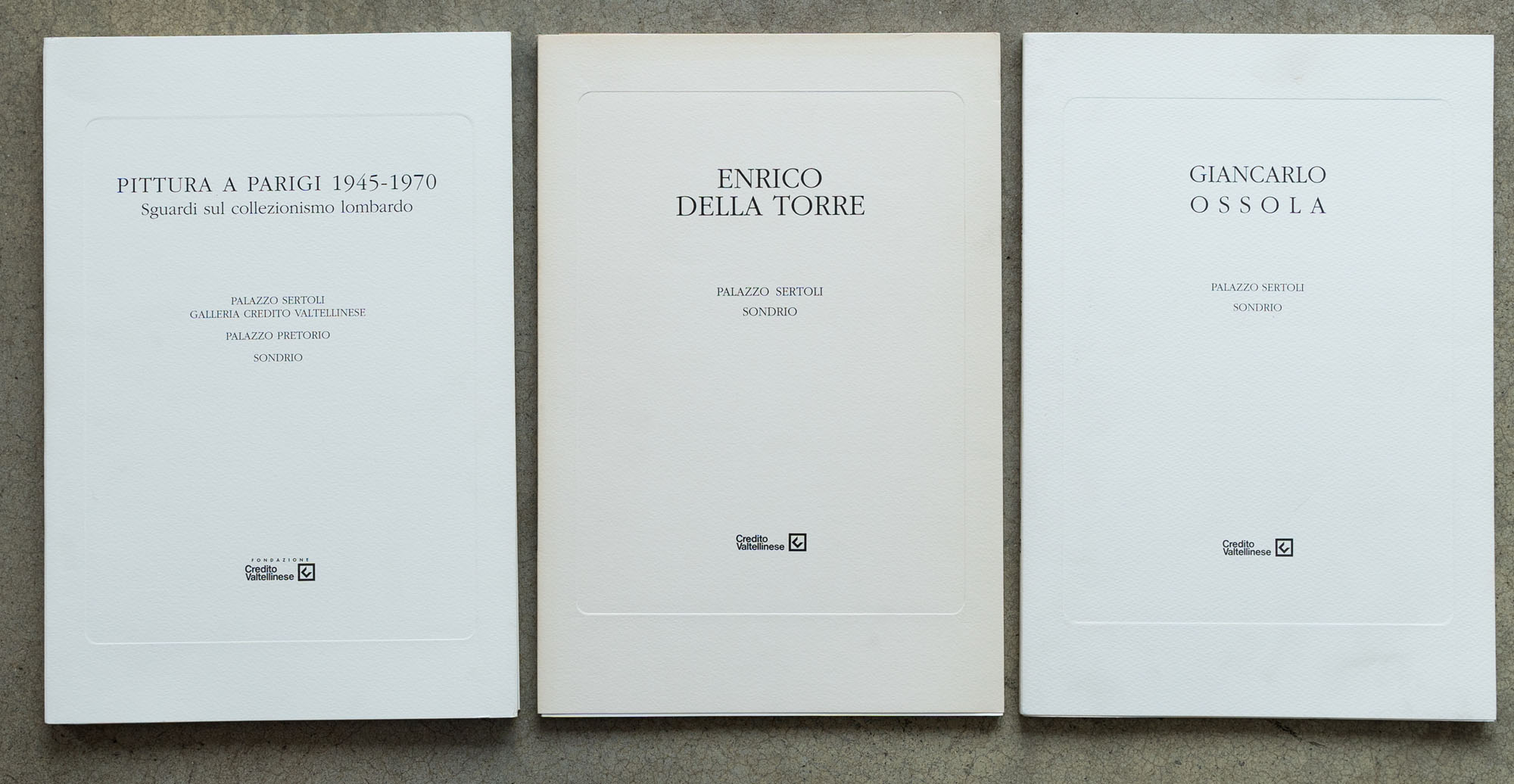 LOTTO MULTIPLOLotto di tre cataloghiGiancarlo Ossola - Interni 1977-19961997Catalogo monografico illustrato edito in occasione della mostra tenutasi presso Palazzo Sertoli, Sondrio (11 dicembre 1996 - 31 gennaio 1997)34 x 23,7 cmEdizione Credito ValtellinesePagine 69DifettiEnrico della Torre - Pitture valtellinesi 1973-19951996Catalogo monografico illustrato edito in occasione della mostra tenutasi presso Palazzo Sertoli, Sondrio (25 luglio - 22 settembre 1996)34 x 23,7 cmEdizione Credito ValtellinesePagine 63DifettiPittura a Parigi 1945-1970. Sguardi sul collezionismo lombardo2000Catalogo illustrato edito in occasione della mostra tenutasi presso Palazzo Sertoli, Sondrio (2 giugno - 22 luglio 2000)34 x 23,7 cmEdizione Credito ValtellinesePagine 130Difetti