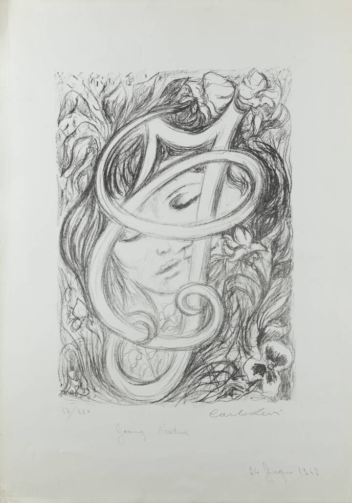 Litografia disegnata da Carlo Levi in occasione delle nozze Mostyn Orengo (scritta al retro a stampa)