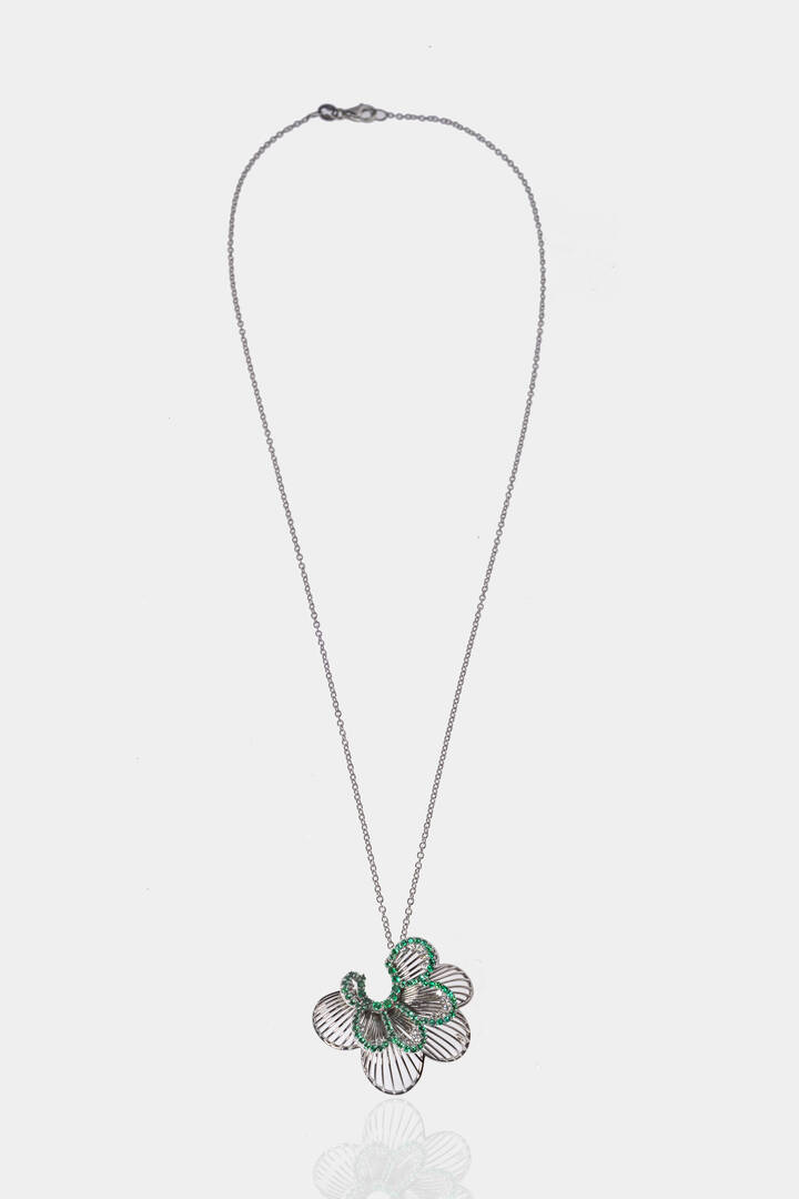 in oro bianco, a forma di fiore, con petali traforati e diamanti taglio brillante per totali ct 0,19 ca, probabile colore G-H, purezza IF-VVS e smeraldi taglio rotondo per totali ct 0,50 ca