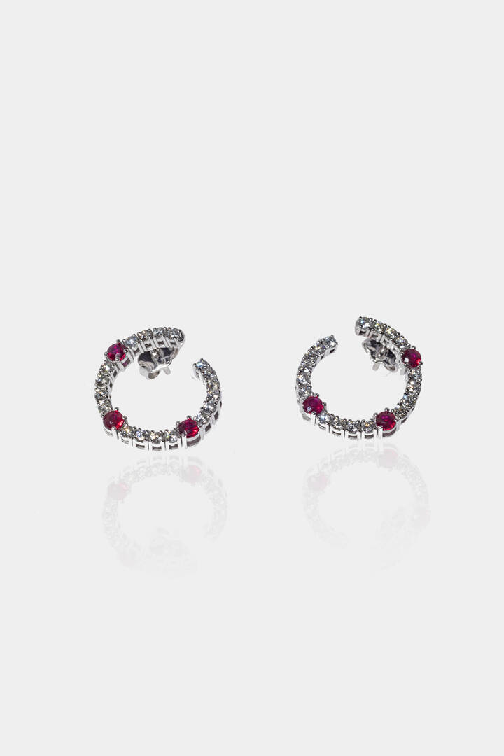 in oro bianco, a cerchio, con diamanti taglio brillante per totali ct 0,99 ca, probabile colore G-H, purezza IF-VVS e sei rubini taglio rotondo per totali ct 0,54 ca