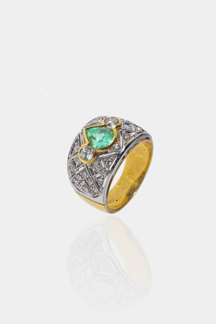 in oro giallo e bianco, a fascia, anni '90, con al centro uno smeraldo taglio a goccia di ct 1,35 ca, e diamanti taglio brillante e 8/8 per totali ct 0,63 ca