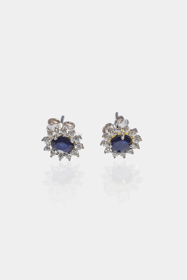 in oro bianco, a margherita, con due zaffiri taglio ovale per totali 0,80 ca e contorno di diamanti taglio brillante per totali ct 0,24 ca.