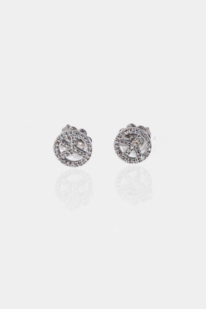 in oro bianco, a lobo, con il simbolo della pace in diamanti taglio brillante per totali ct 0,15 ca, probabile colore G-H, purezza IF-VVS