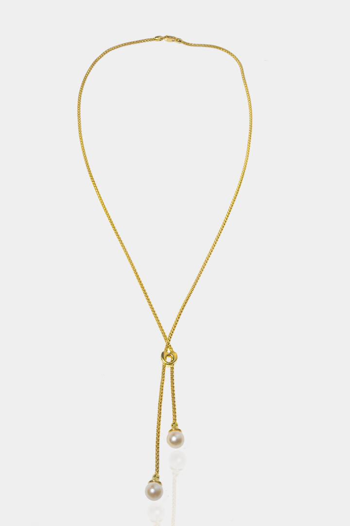 in oro giallo, lavorato a corda, al centro cuore trattenente due frange terminanti con due perle giapponesi del diam di mm 7,3 e 7,4.