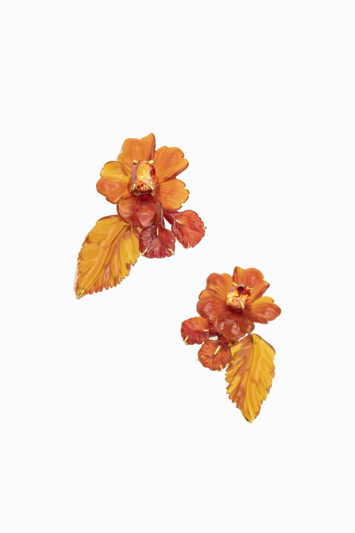 in oro giallo con corniole incise a motivi floreali; al centro due quarzi sintetici arancio.