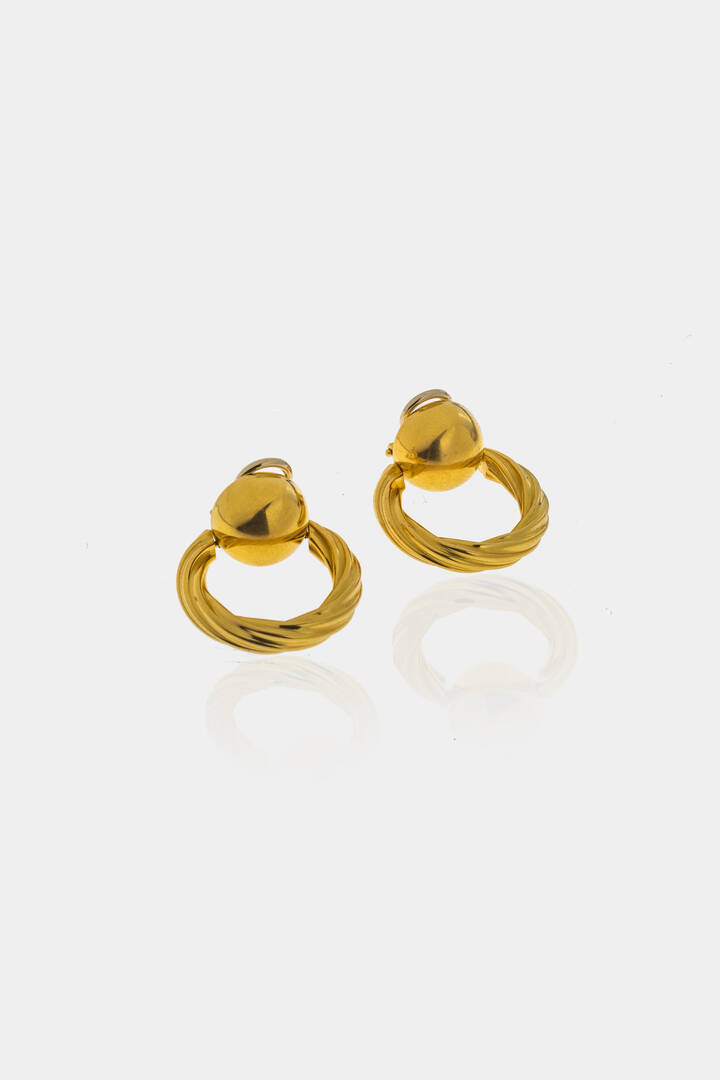 in oro giallo, a clip, composti da semisfera ai lobi, trattenenti due cerchi lavorati a torchon.