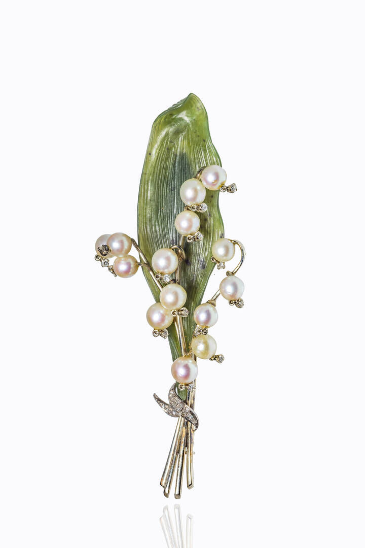 in oro bianco a forma di mazzo di mughetti, con perle giapponesi del diam di mm 5 ca, diamanti taglio 8/8 e rosette per totali ct 0,25 ca e foglia in nefrite.