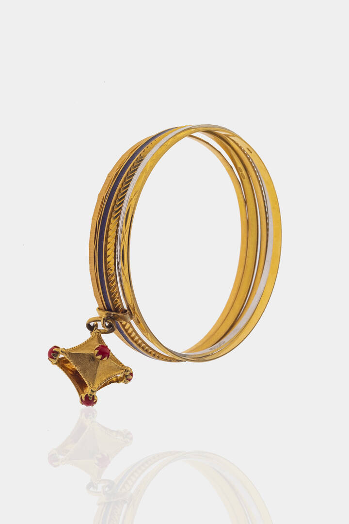 - tre bracciali rigidi in oro giallo, di cui due satinati e lavorati ed uno decorato con smalto blu; raccordati tra loro da ciondolo geometrico satinato con sfere di corallo rosso.