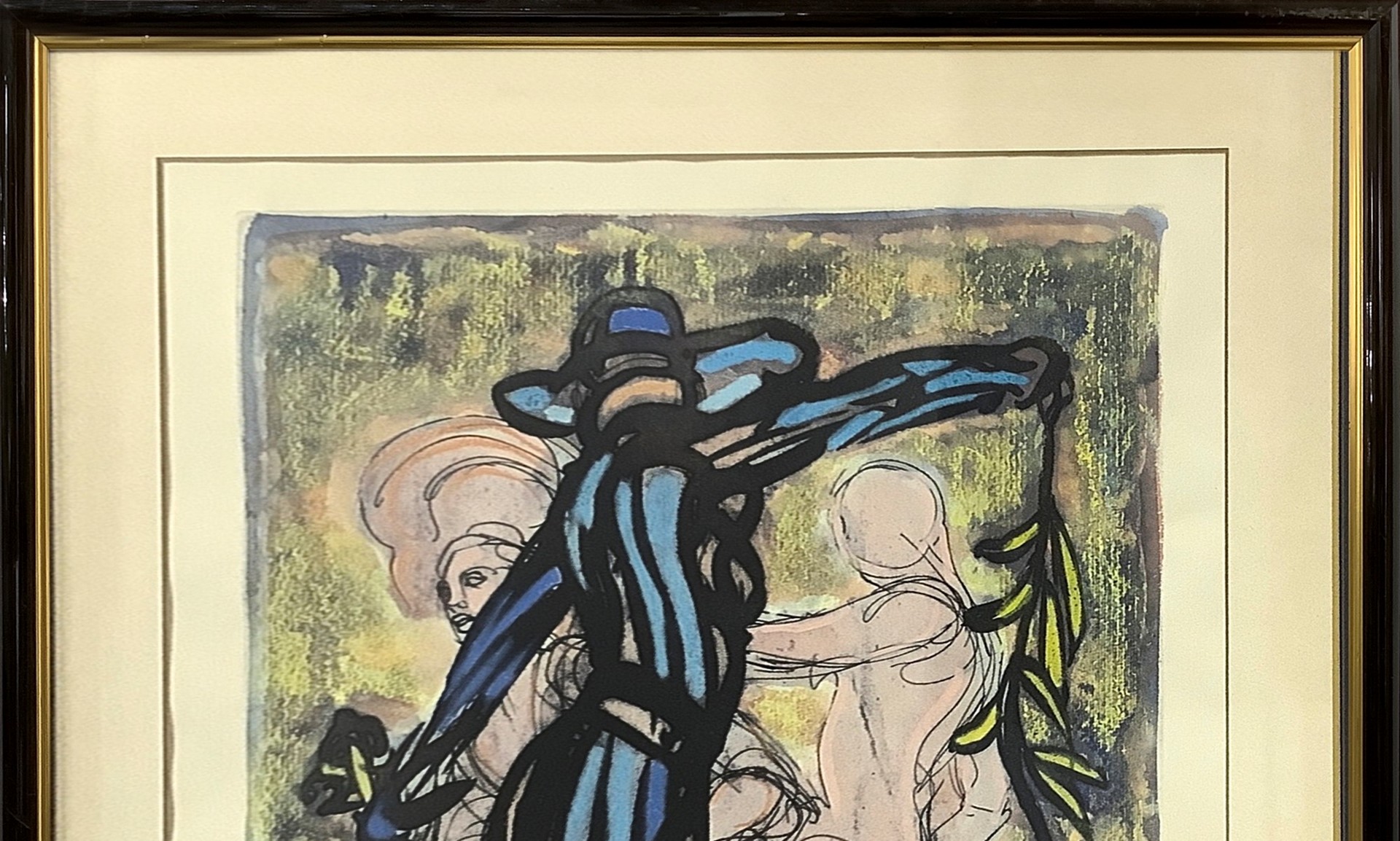 Antonio Santacroce (Rosolini 1945) - Uomo con cappello e donne danzanti , 1989 cm 56x43, in cornice 74x58 cm Acquaforte acquarellata a mano Tiratura 1/100, firmata in basso a destra, riporta scritta “colorato a mano” in basso a sinistra e certificato di garanzia sul retro. Edizione La Vite, Catania.