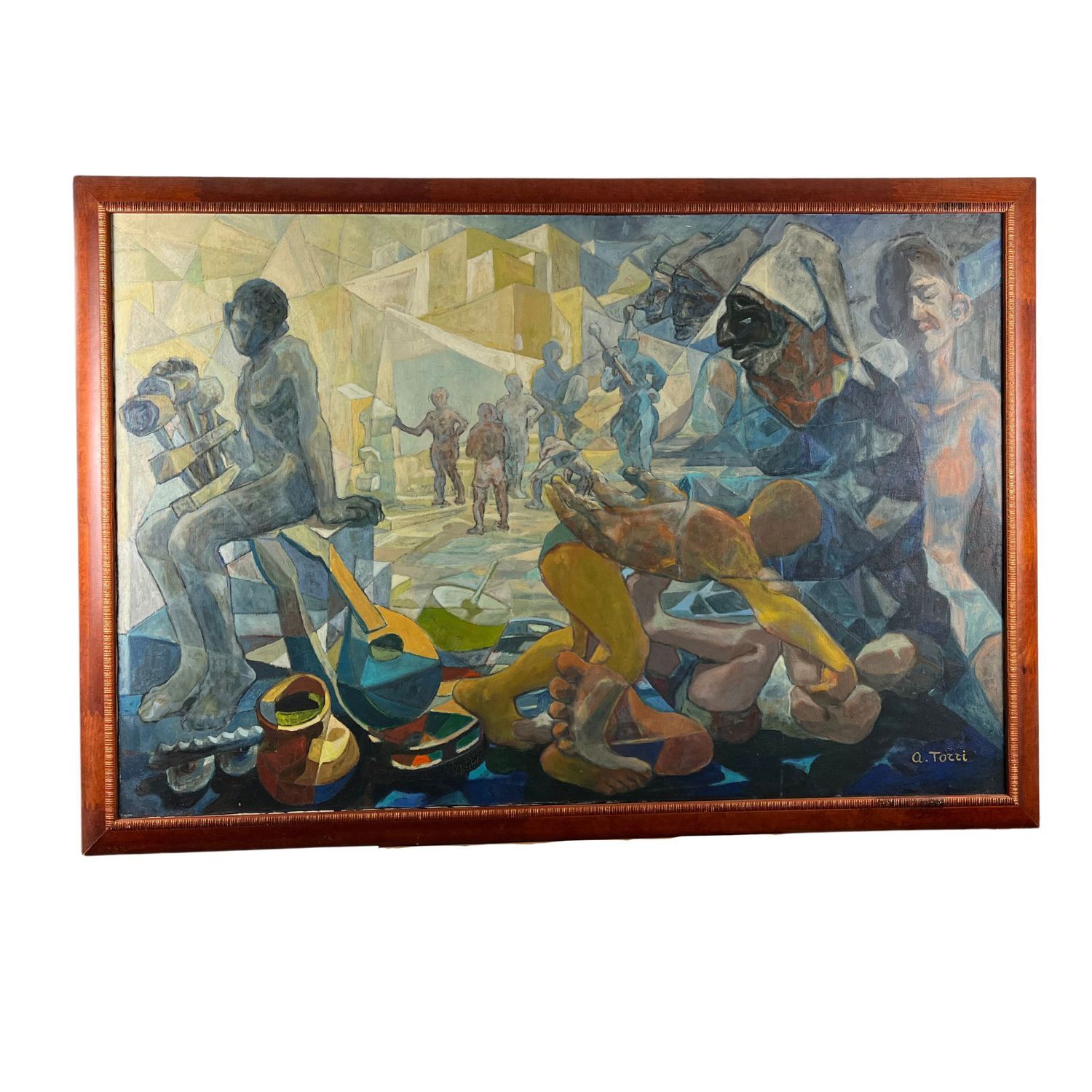 Dipinto olio su tela, XX secolo scuola italiana, raffigurante Fantasia Napoletana. Firma non identificata Dimensioni: 130x90 in cornice, 120x80 interno cornice. Buone condizioni, con piccoli segni di vissuto.