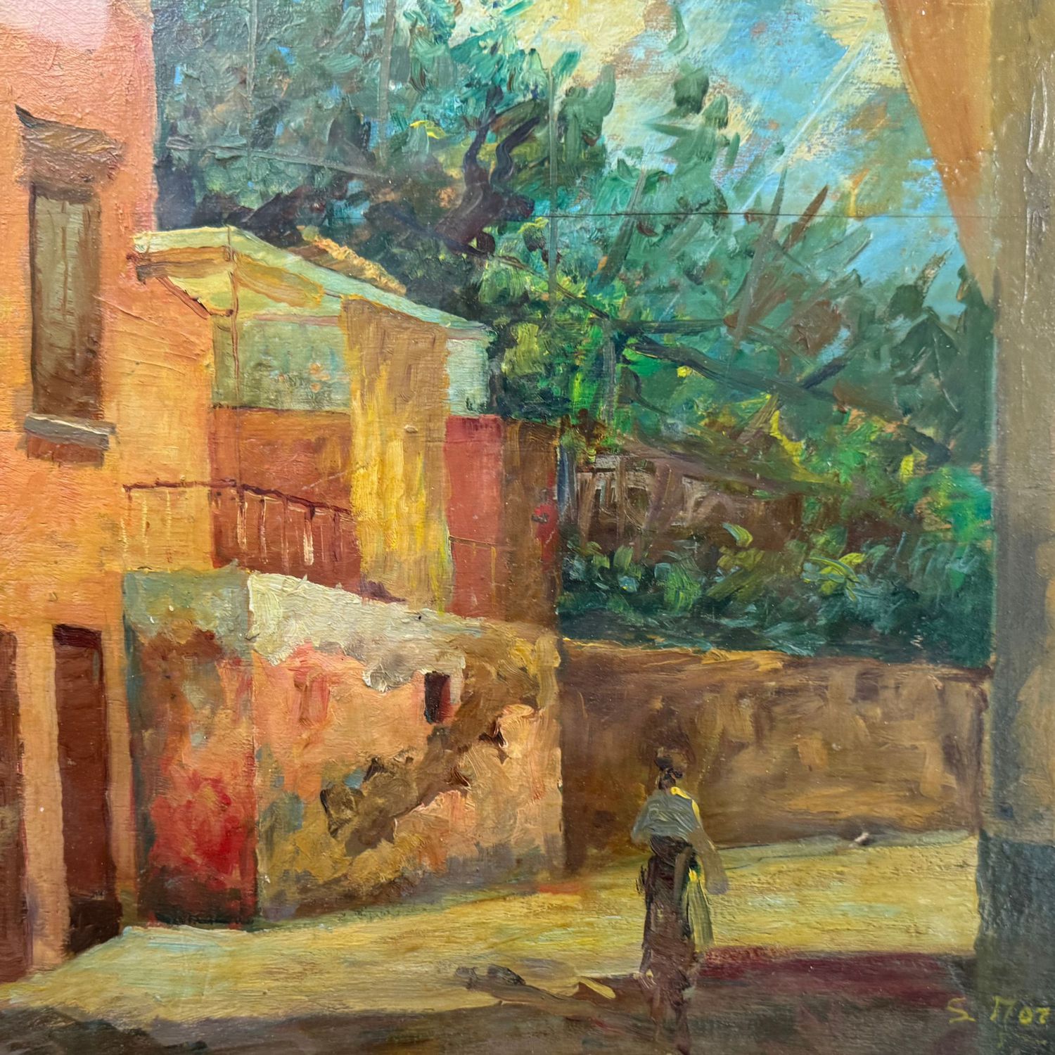 Dipinto olio su pannello, periodo XX secolo scuola Italiana, raffigurante Paesaggio di campagna (luogo imprecisato)