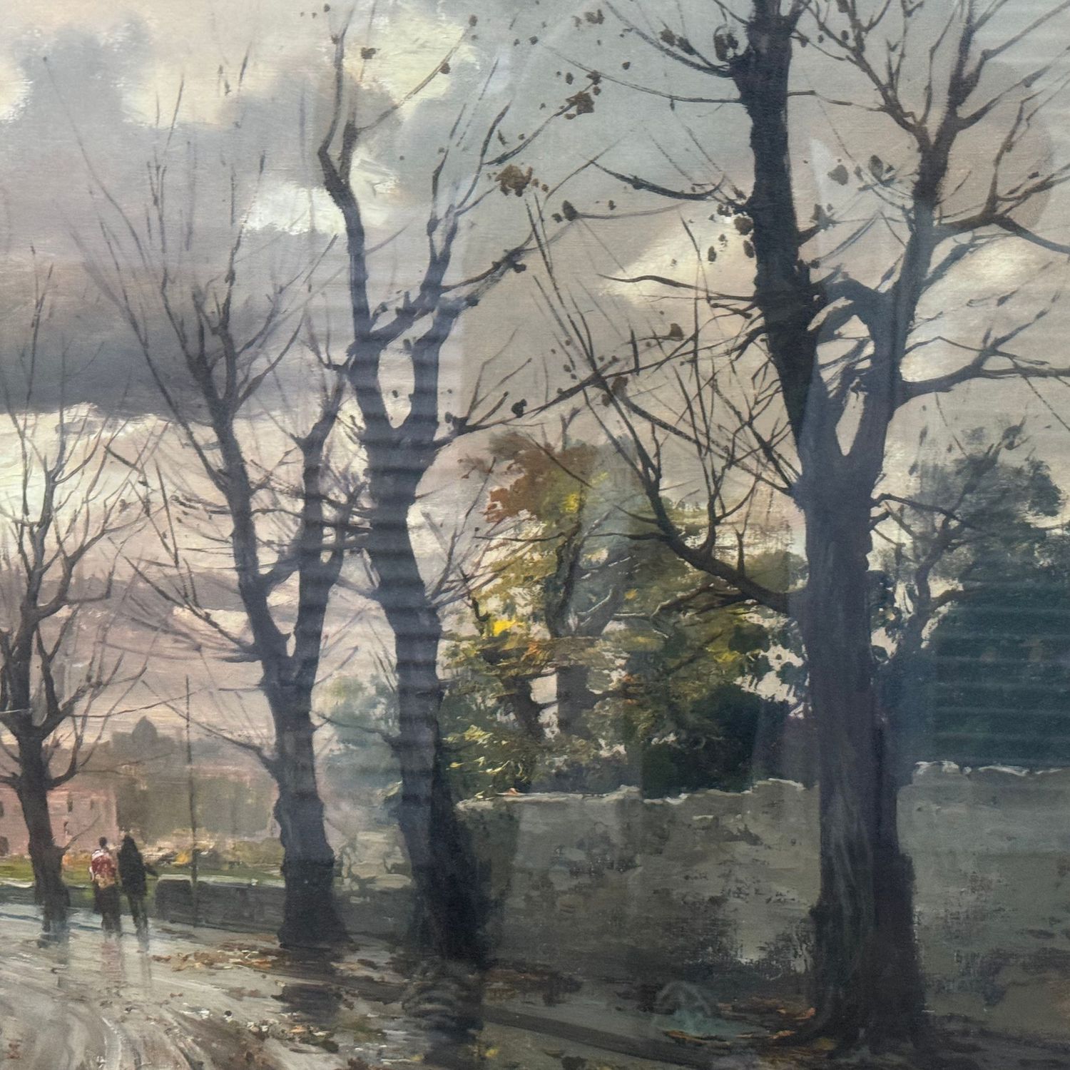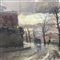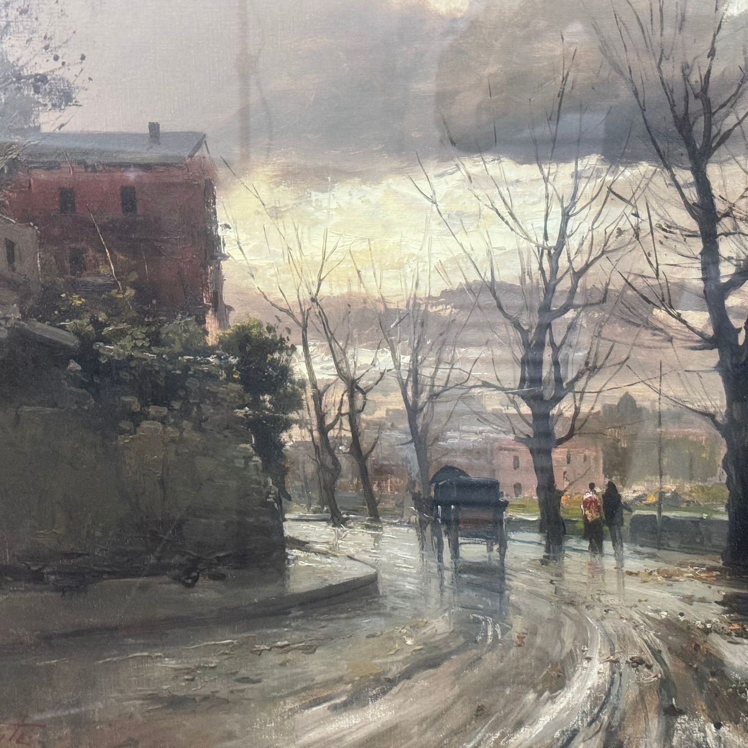 Dipinto olio su tela, periodo XX secolo scuola Italiana raffigurante Strada con alberi e carrozza.