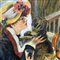 Dipinto olio su tela, periodo XX secolo scuola Italiana, raffigurante Bambina con gatto, copia d'autore Pierre August Renoir.