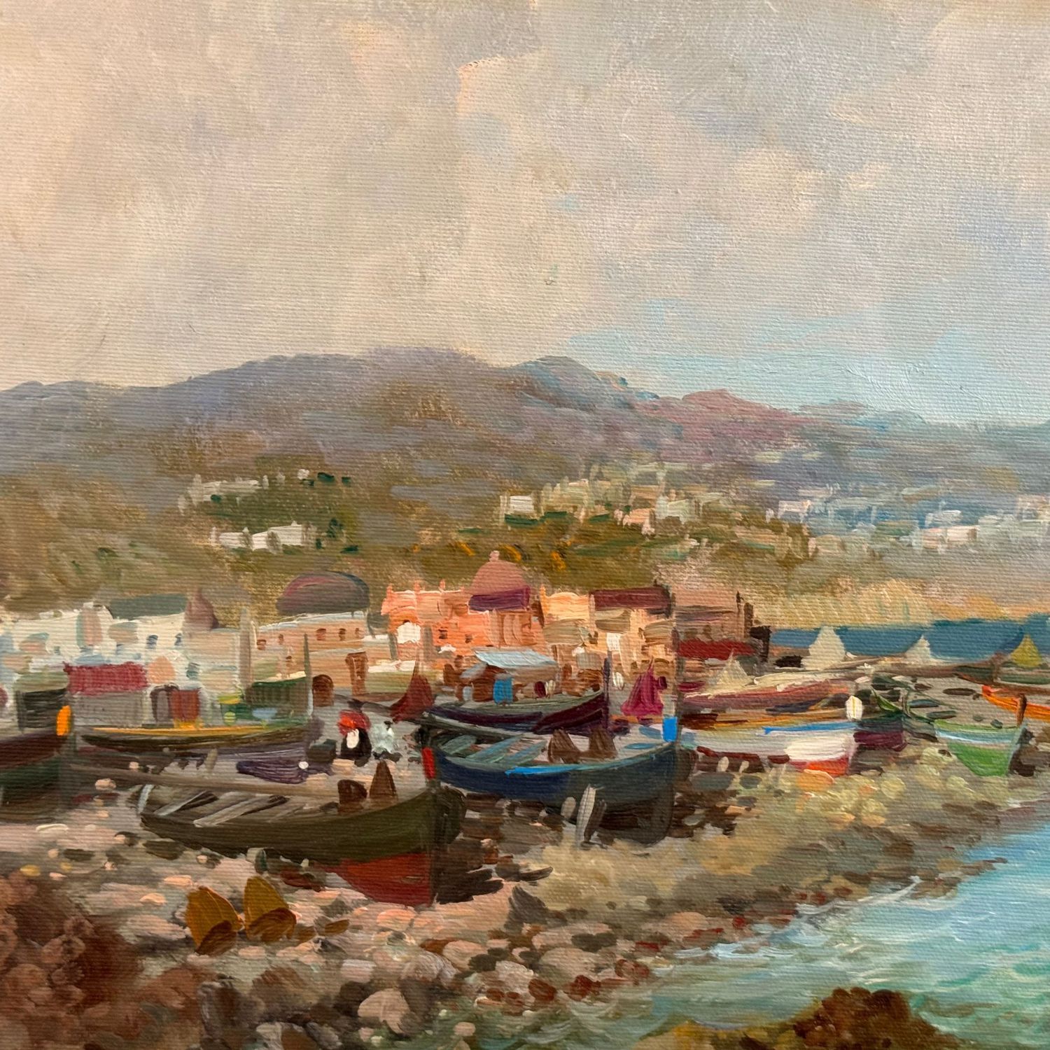Dipinto olio su tela, periodo XX secolo scuola italiana, raffigurante Paesaggio marino con barche a secco.