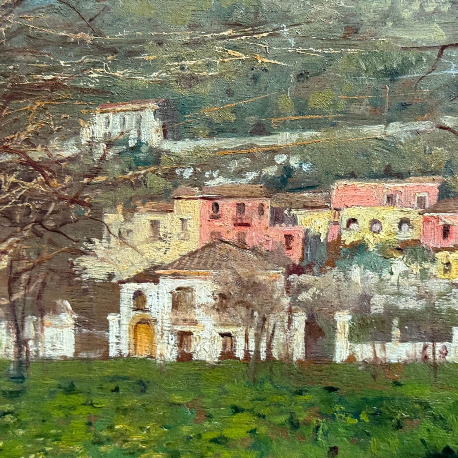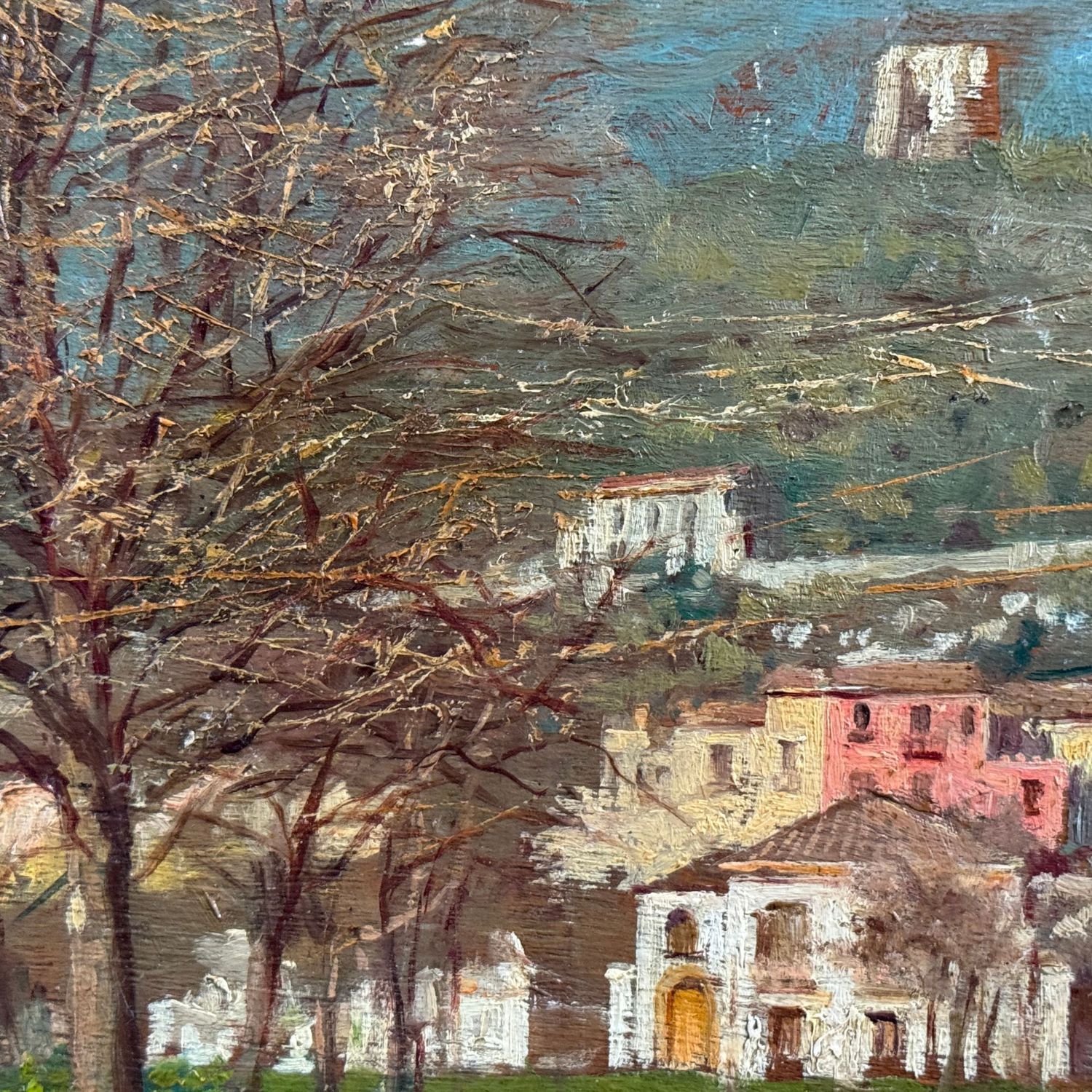 Dipinto olio su tavola, periodo XX secolo scuola Italiana, raffigurante Scorcio di paese (Luogo imprecisato)