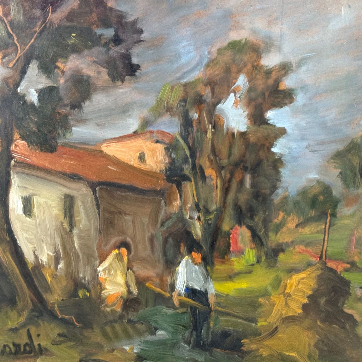 Dipinto olio su pannello, periodo XX secolo scuola Italiana, raffigurante Contadini in campagna.
