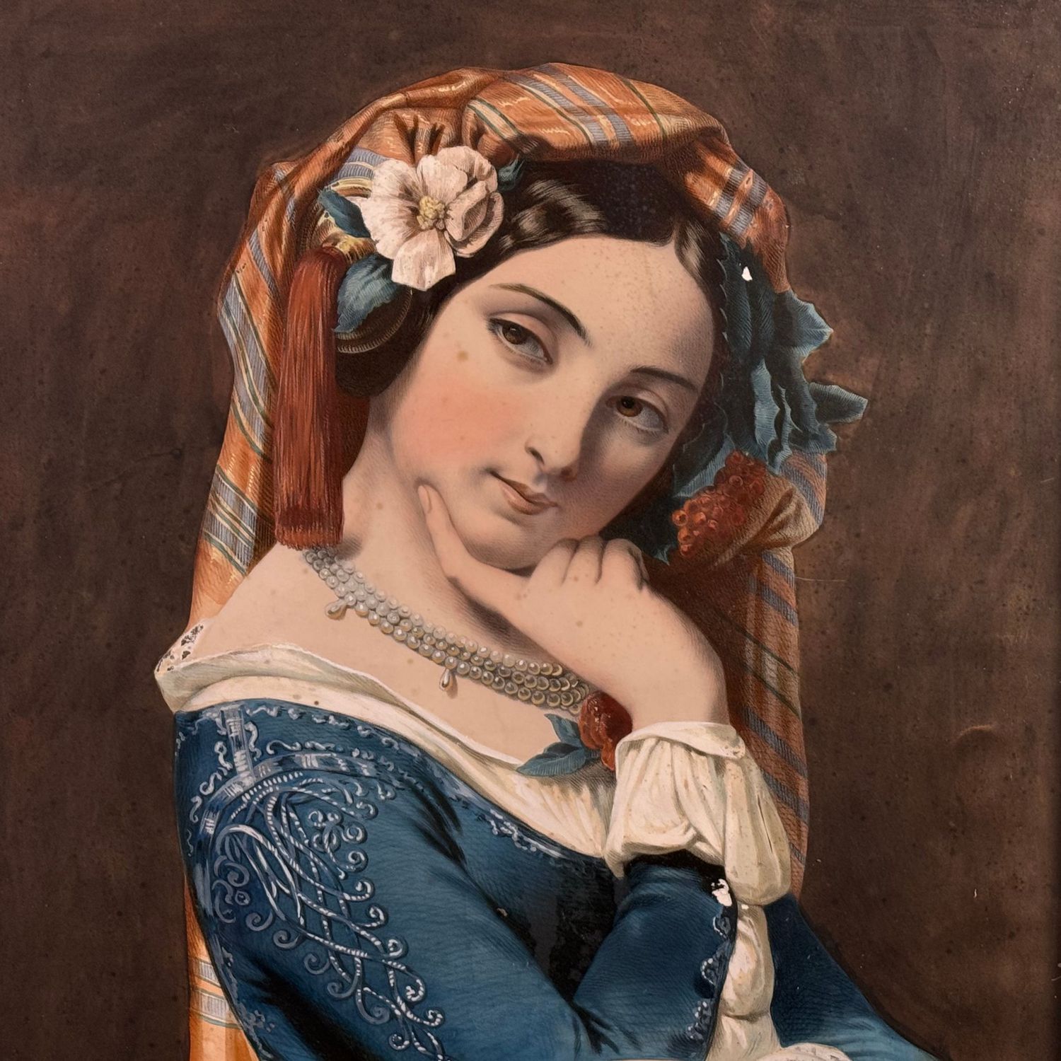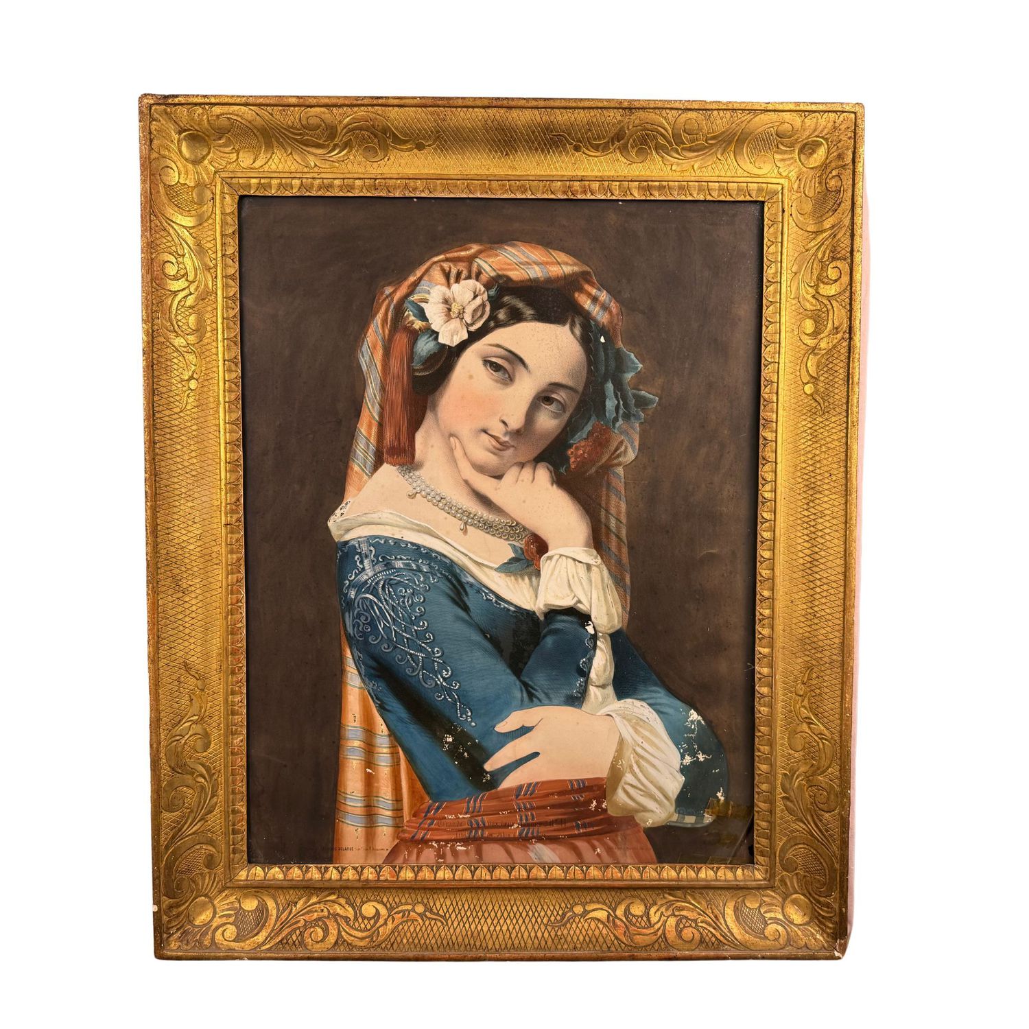 Antica stampa acquerellata, in cornice di periodo impero Italia XIX secolo, raffigurante Ritratto di giovane donna.