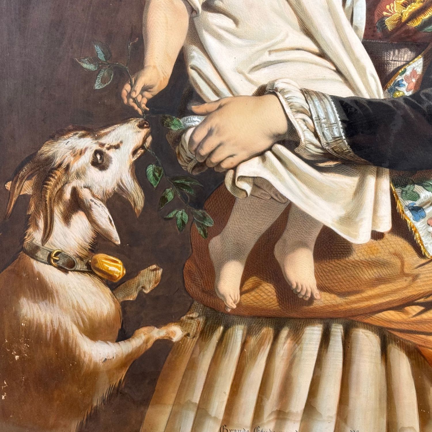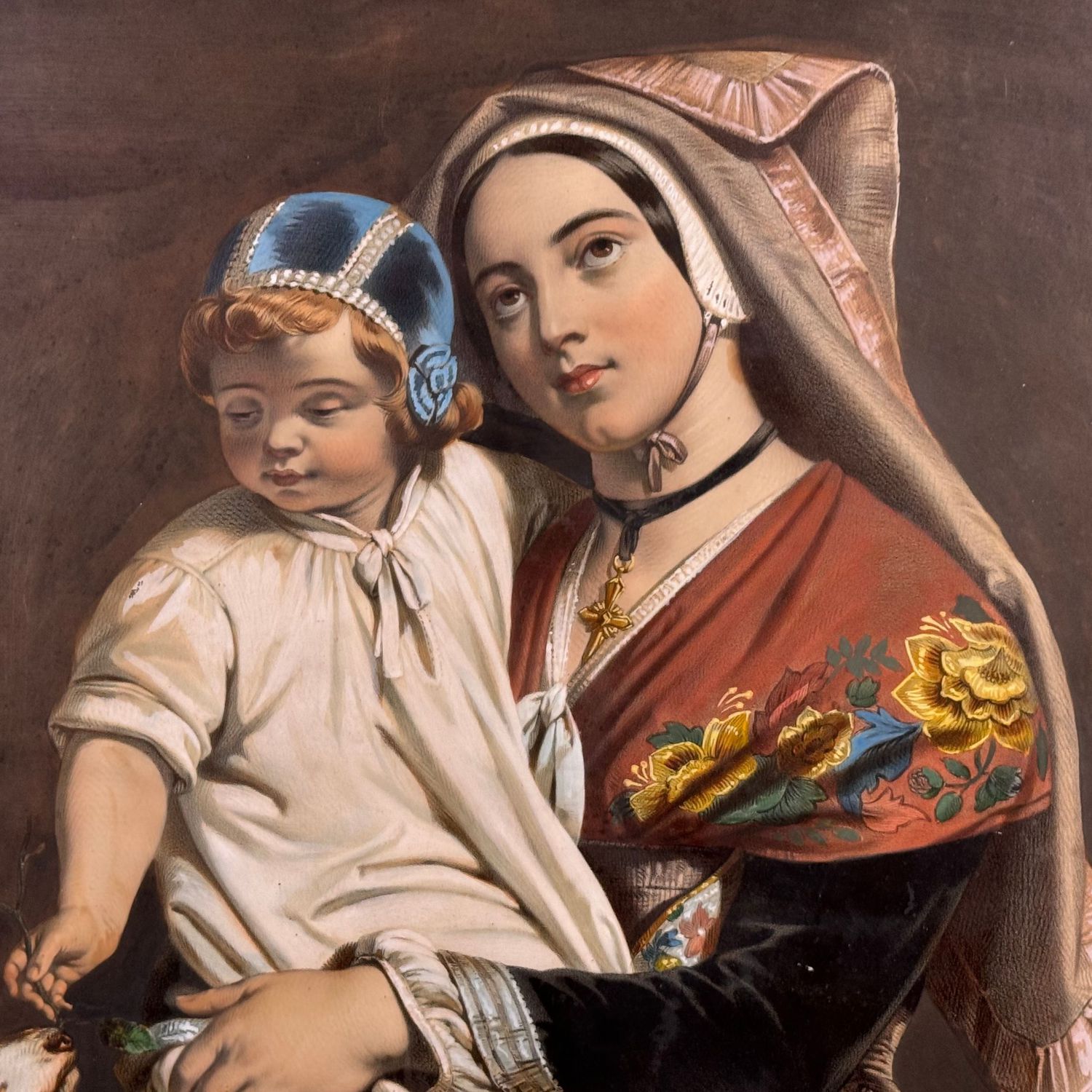 Antica stampa acquerellata in cornice di periodo Impero Italia XIX secolo, raffigurante Maternità.