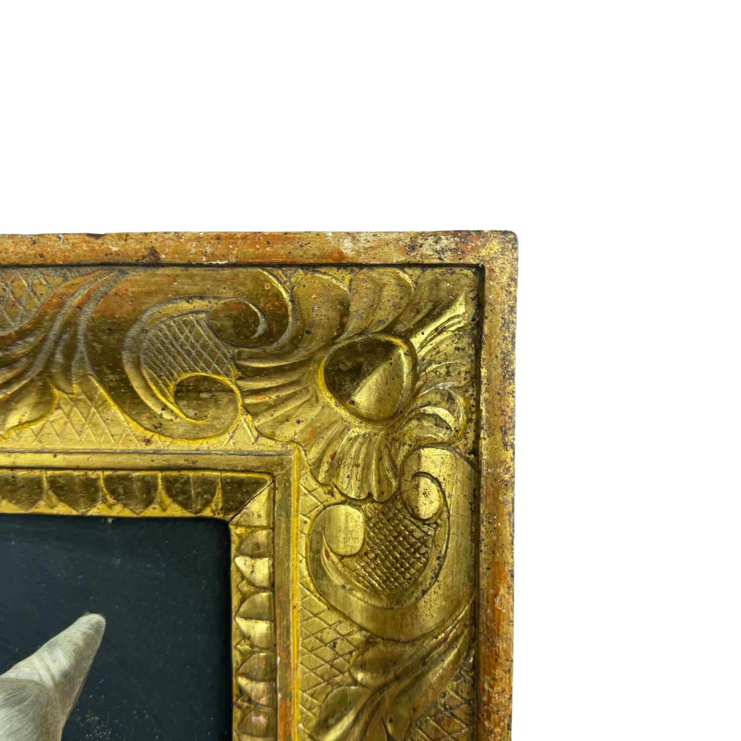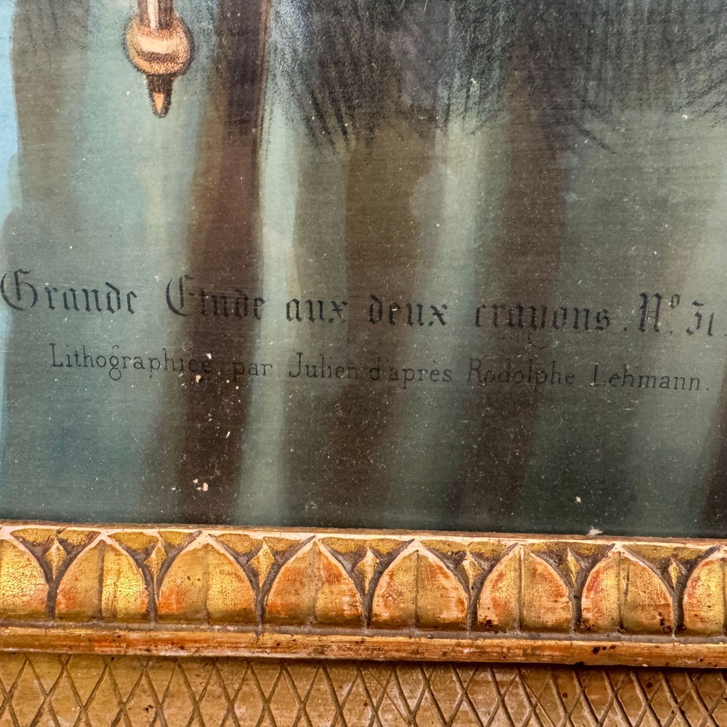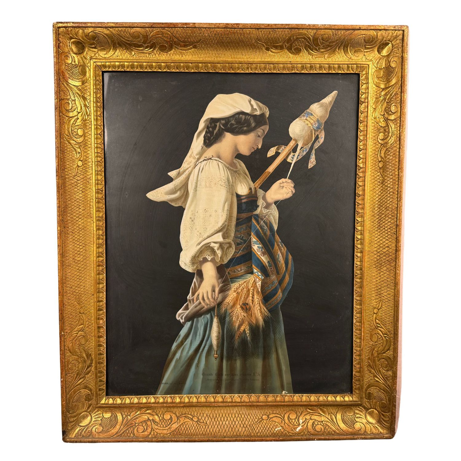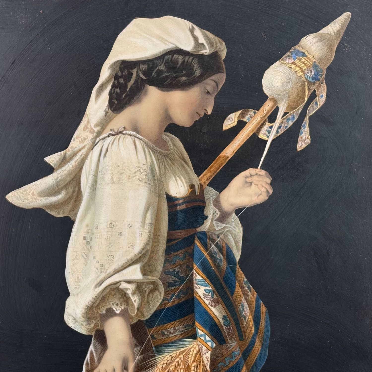 Antica stampa acquerellata in cornice di periodo Impero Italia XIX secolo, raffigurante La ricamatrice.