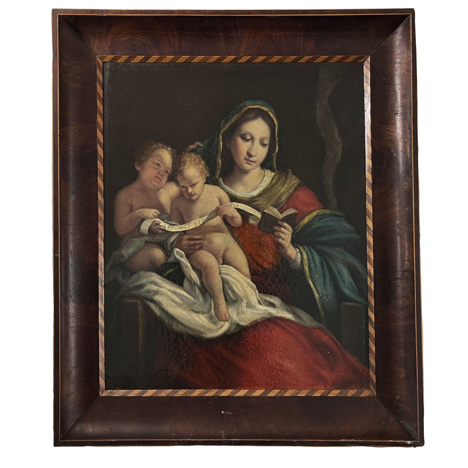 Dipinto olio su tela, raffigurante Vergine Maria, Gesù Bambino e San Giovanino. Scuola Italiana XIX/XX secolo.