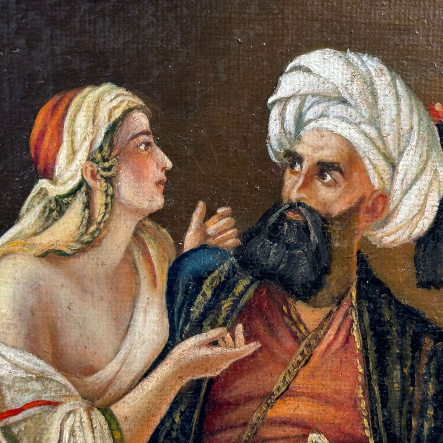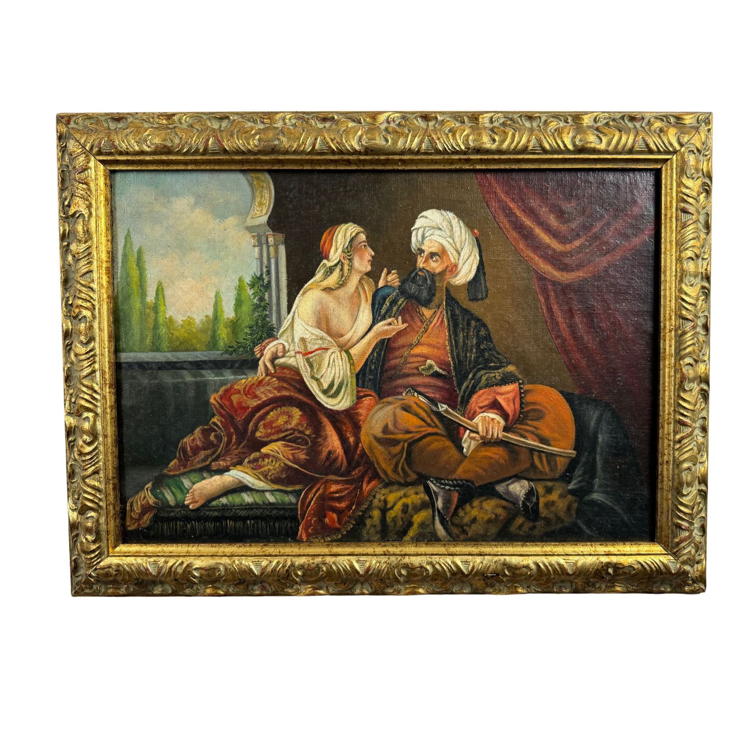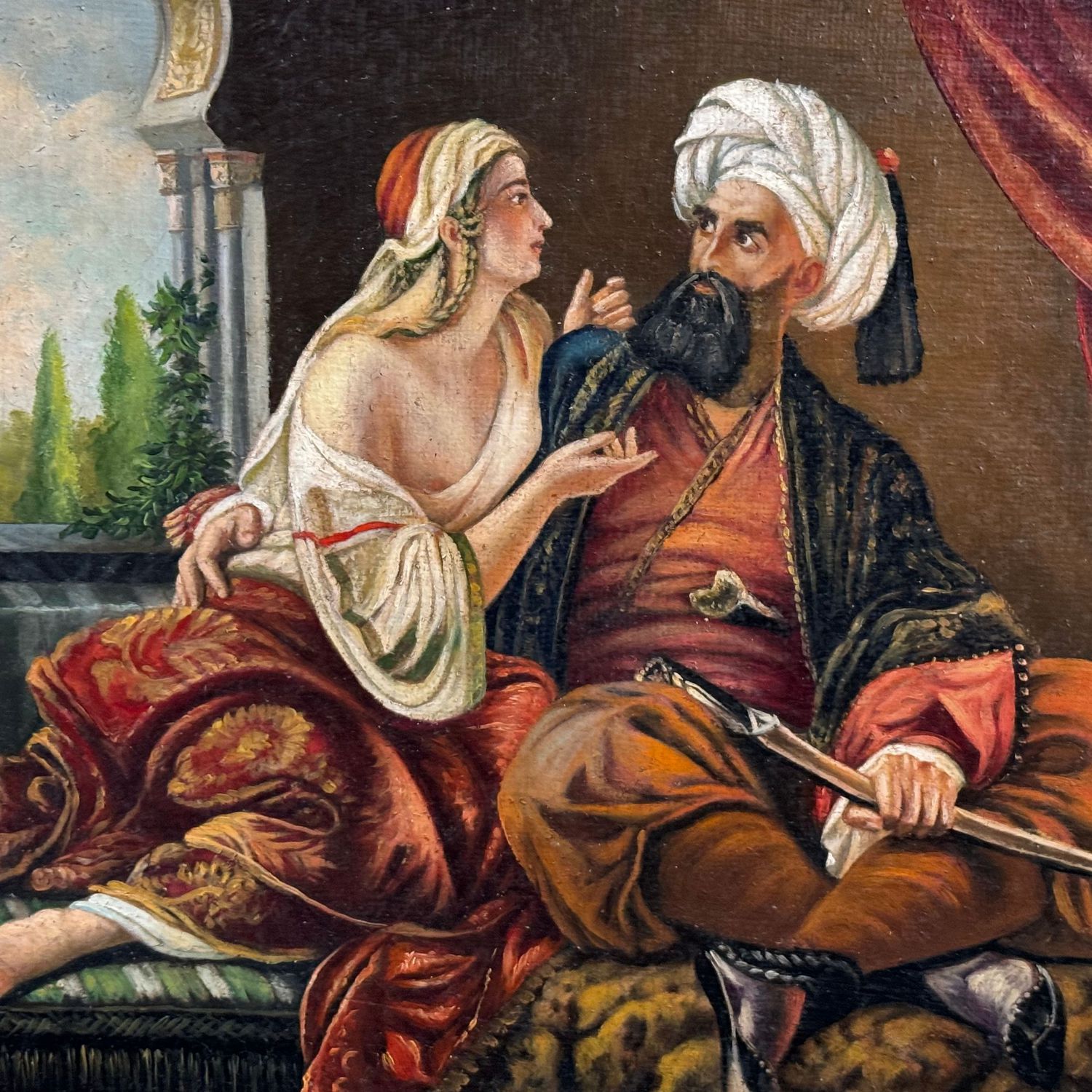 Dipinto olio su tela, periodo XIX/XX secolo scuola Italiana, tratto da un'opera di Emil Jacobs, raffigurante Ali Pasha e Kira Vassiliki.