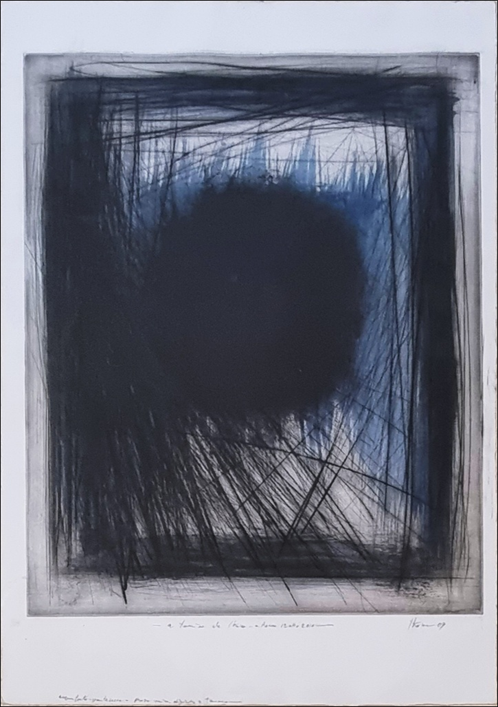 STRAZZA GUIDO Grosseto 1922 "Segni" Acquaforte, punta secca, prova unica, dipinta a mano cm 35x50. Firmata e datata sul fronte in basso a destra, tecnica in basso a sinistra. Autentica su foto a cura del Maestro, foto dell'Artista con l'opera.