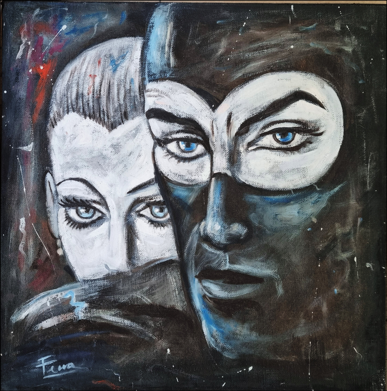 FENA Lecce 1958 "Diabolik" Olio su tela cm 59x59. Firmato sul fronte in basso a sinistra, firma per ideogramma al retro. Autentica dell'Artista su foto.