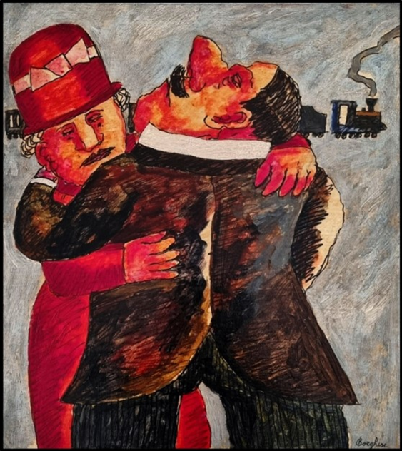 BORGHESE FRANZ Roma 1941 - 2005 "L'abbraccio" Olio su tavola cm 40x45. Firmato sul fronte in basso a destra. Sul retro firma ed etichetta descrittiva. Autentica su foto del Maestro, con timbro a secco.