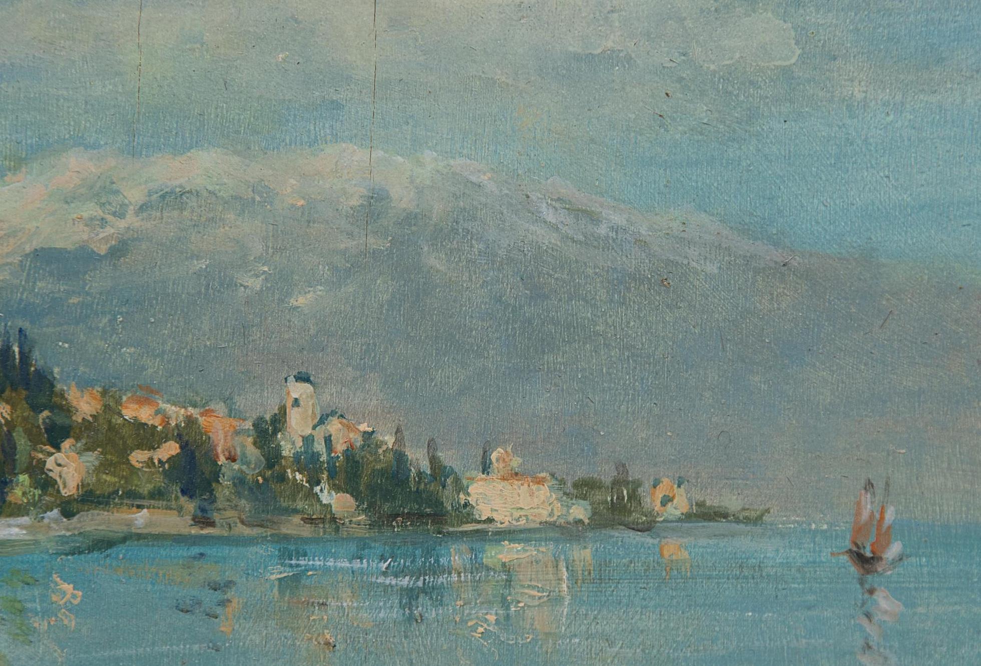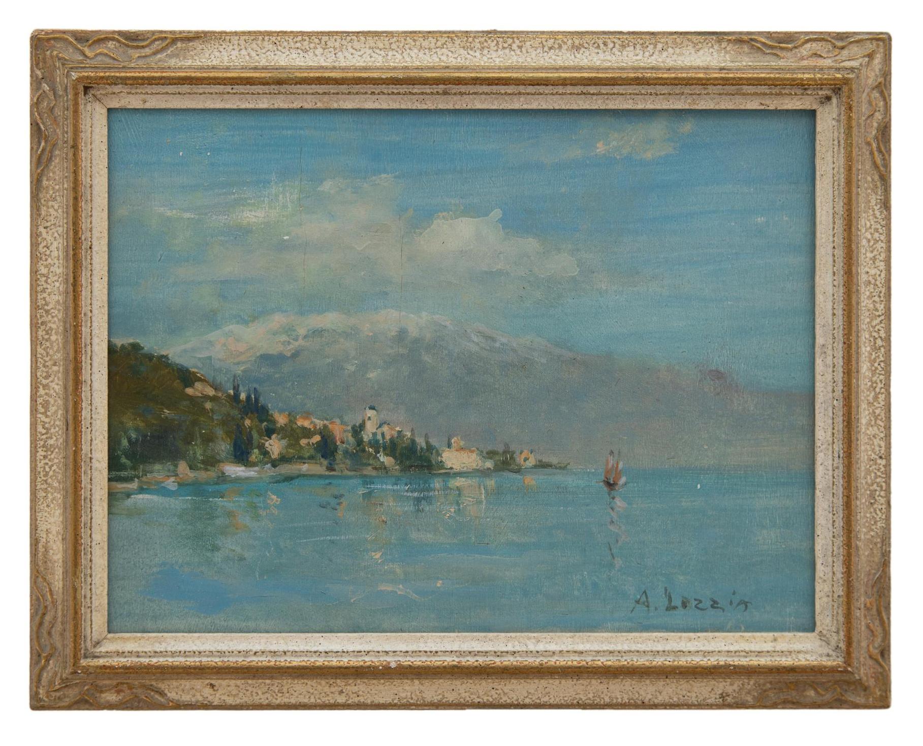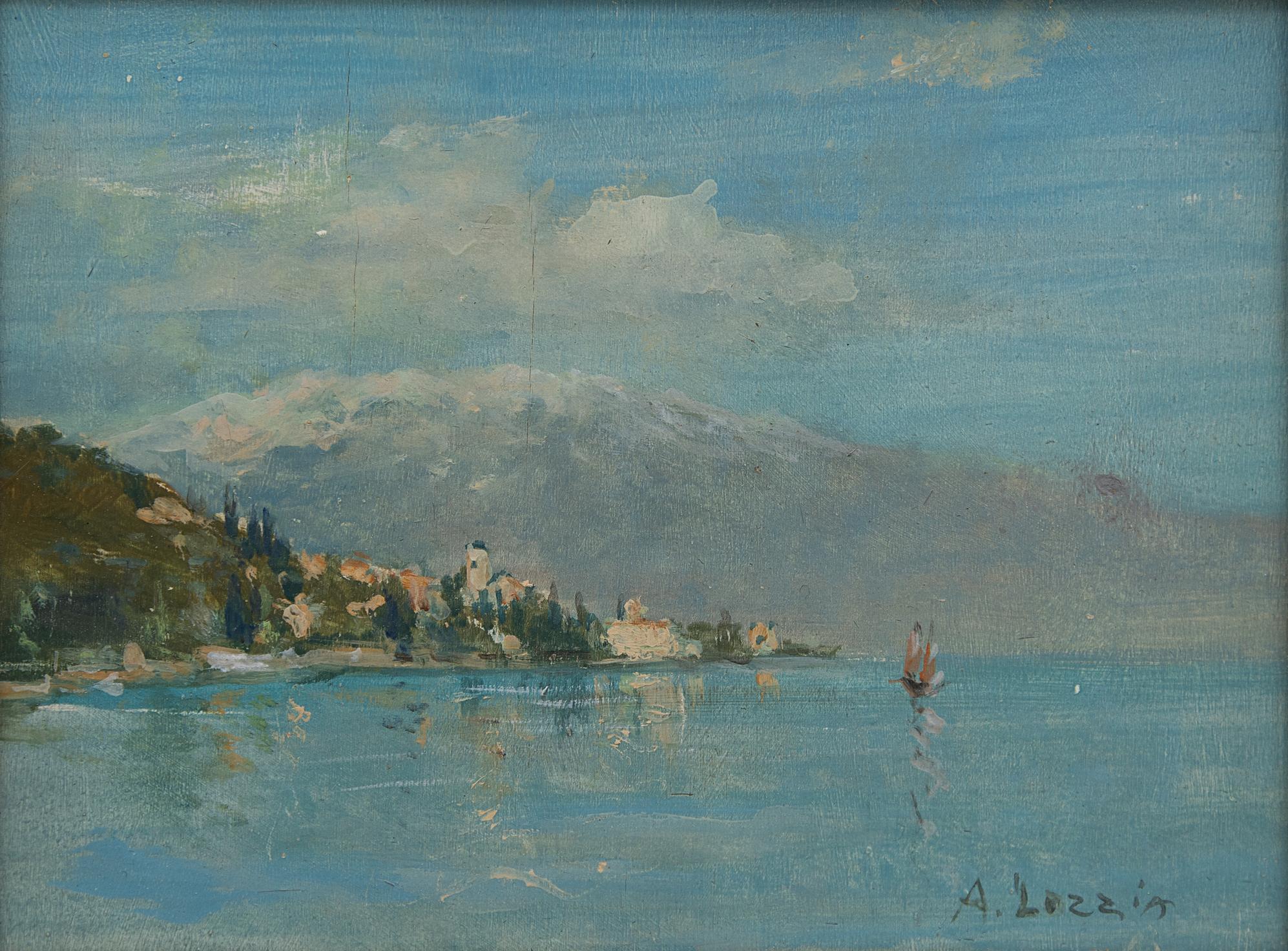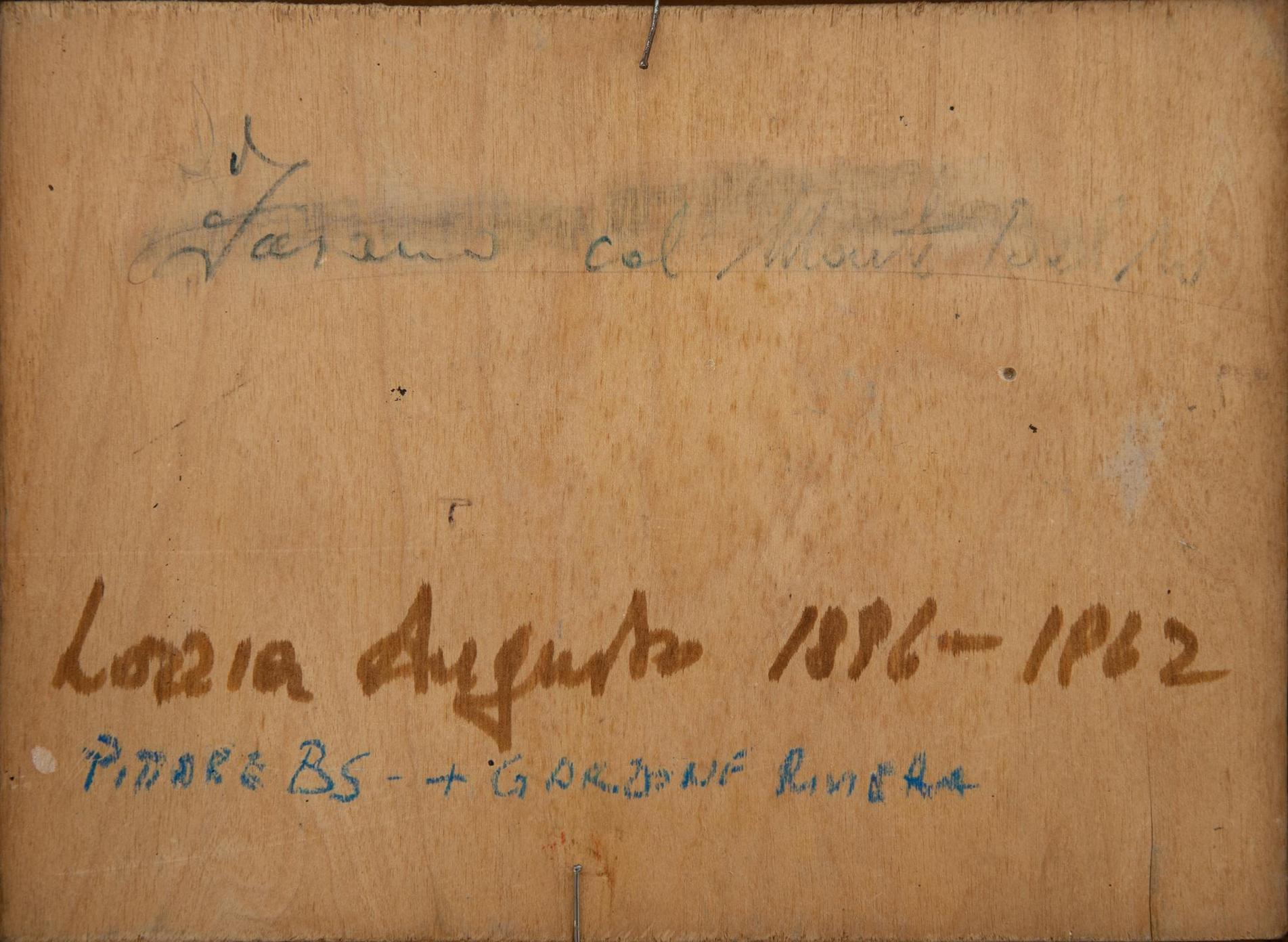 Augusto Lozzia - Gardone Riviera - Brescia 1896 - 1962 - Olio su tavola cm 17x24 - Nato a Sangiano nel 1896, studia come autodidatta, inizia la sua carriera artistica molto giovane, esponendo le sue opere alla Permanente di Milano nel 1915 e partecipando a mostre sindacali e interprovinciali sia a Milano che a Brescia.Durante la prima guerra mondiale, si arruola come soldato. Questo pittore lombardo della prima metà del Novecento ottenne notorietà quando una sua opera fu esposta nel 1916 nella mostra tenuta a Brescia nel Ridotto del Teatro Grande.Successivamente, la sua famiglia si trasferì a Brescia, dove dal 1921 al 1925 intensificò i suoi legami con gli artisti locali, tra cui Eliodoro Coccoli, Vittorio Trainini, Angelo Landi, Fiessi, Mozzoni, Mutti, Botta e Righetti, prendendo parte al gruppo "Arte in famiglia" e alla Bottega d'Arte di Dante Bravo. Collaborò anche con la scuola superiore di Arte cristiana "Beato Angelico" di Milano.La sua versatilità artistica spaziava dall'affresco al ritratto al paesaggio. Durante questo periodo, realizzò la Pala d'altare raffigurante la Madonna del Santo Rosario nella Basilica di Sant'Eufemia a Milano, affreschi nella Basilica di San Calimero e angeli nella cappella dei Caduti nella Chiesa della S.S. Trinità, sempre a Milano.Nel 1924, Vittorio Trainini lo invitò a partecipare insieme ad altri artisti del gruppo a un ciclo di affreschi nella Chiesa del Buon Pastore a Villa S. Filippo, Brescia.Nel 1927, segnò un importante cambiamento nella sua vita quando si ritirò dall'arte per dedicarsi alla sua vita sentimentale, sposando Margherita Milanesio, una musicista appassionata che lo ispirò in numerosi studi e dipinti. Si stabilì a Gardone Riviera sul Lago di Garda, dove trascorse la maggior parte della sua vita, tranne brevi soggiorni estivi nella zona di Ponte di Legno.Nel 1946, ricoprì il ruolo di Presidente del comitato promotore della "Fraglia Artistica del Benaco," un'associazione che includeva il pittore Gregorio Sciltian, gli architetti Giancarlo Maroni e Paolo Besana, e il musicista Nando Benvenuti.La sua arte abbracciò vari temi, da paesaggi rurali come la raccolta Bravi nella campagna piemontese alle montagne intorno a Ponte di Legno. Tuttavia, il suo amore più grande fu dedicato al ritratto del Lago di Garda, che dipinse instancabilmente. Nel 1938, illustrò il Vittoriale degli Italiani con una serie di quadri donati alla Comunità di Gardone Riviera nel giugno 2014. Queste opere sono attualmente esposte nella sala di ingresso principale del palazzo Comunale di Gardone. Come ritrattista, ritrasse non solo personaggi famosi italiani e stranieri, ma anche semplici abitanti di Gardone e della Riviera.La sua dedizione all'arte sacra è testimoniata da affreschi, una Via Crucis, una Crocifissione e una Pietà, presenti nella chiesa parrocchiale di San Nicolò di Gardone sopra e nella chiesa di Gardone Basso. Le sue opere sono ancora conservate dalla sua famiglia.Morì il 31 dicembre 1962, ma il suo lascito artistico perdura. In suo onore, la scuola elementare di Gardone Riviera porta il suo nome.